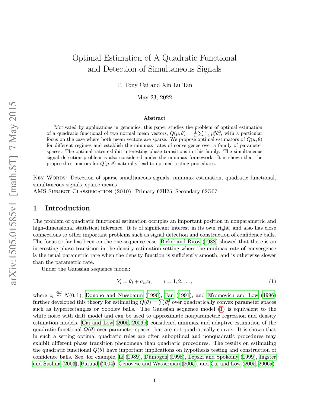Motivated by applications in genomics, this paper studies the problem of optimal estimation of a quadratic functional of two normal mean vectors, , with a particular focus on the case where both mean vectors are sparse. We propose optimal estimators of for different regimes and establish the minimax rates of convergence over a family of parameter spaces. The optimal rates exhibit interesting phase transitions in this family. The simultaneous signal detection problem is also considered under the minimax framework. It is shown that the proposed estimators for naturally lead to optimal testing procedures.