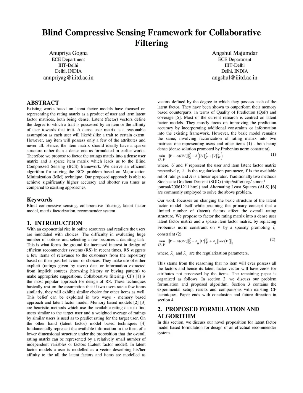 Existing works based on latent factor models have focused on representing the rating matrix as a product of user and item latent factor matrices, both being dense. Latent (factor) vectors define the degree to which a trait is possessed by an item or the affinity of user towards that trait. A dense user matrix is a reasonable assumption as each user will like/dislike a trait to certain extent. However, any item will possess only a few of the attributes and never all. Hence, the item matrix should ideally have a sparse structure rather than a dense one as formulated in earlier works. Therefore we propose to factor the ratings matrix into a dense user matrix and a sparse item matrix which leads us to the Blind Compressed Sensing (BCS) framework. We derive an efficient algorithm for solving the BCS problem based on Majorization Minimization (MM) technique. Our proposed approach is able to achieve significantly higher accuracy and shorter run times as compared to existing approaches.