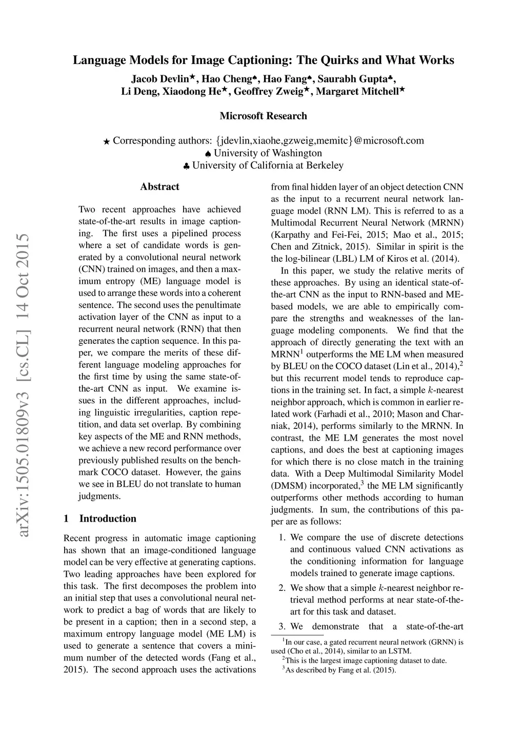 Two recent approaches have achieved state-of-the-art results in image captioning. The first uses a pipelined process where a set of candidate words is generated by a convolutional neural network (CNN) trained on images, and then a maximum entropy (ME) language model is used to arrange these words into a coherent sentence. The second uses the penultimate activation layer of the CNN as input to a recurrent neural network (RNN) that then generates the caption sequence. In this paper, we compare the merits of these different language modeling approaches for the first time by using the same state-of-the-art CNN as input. We examine issues in the different approaches, including linguistic irregularities, caption repetition, and data set overlap. By combining key aspects of the ME and RNN methods, we achieve a new record performance over previously published results on the benchmark COCO dataset. However, the gains we see in BLEU do not translate to human judgments.