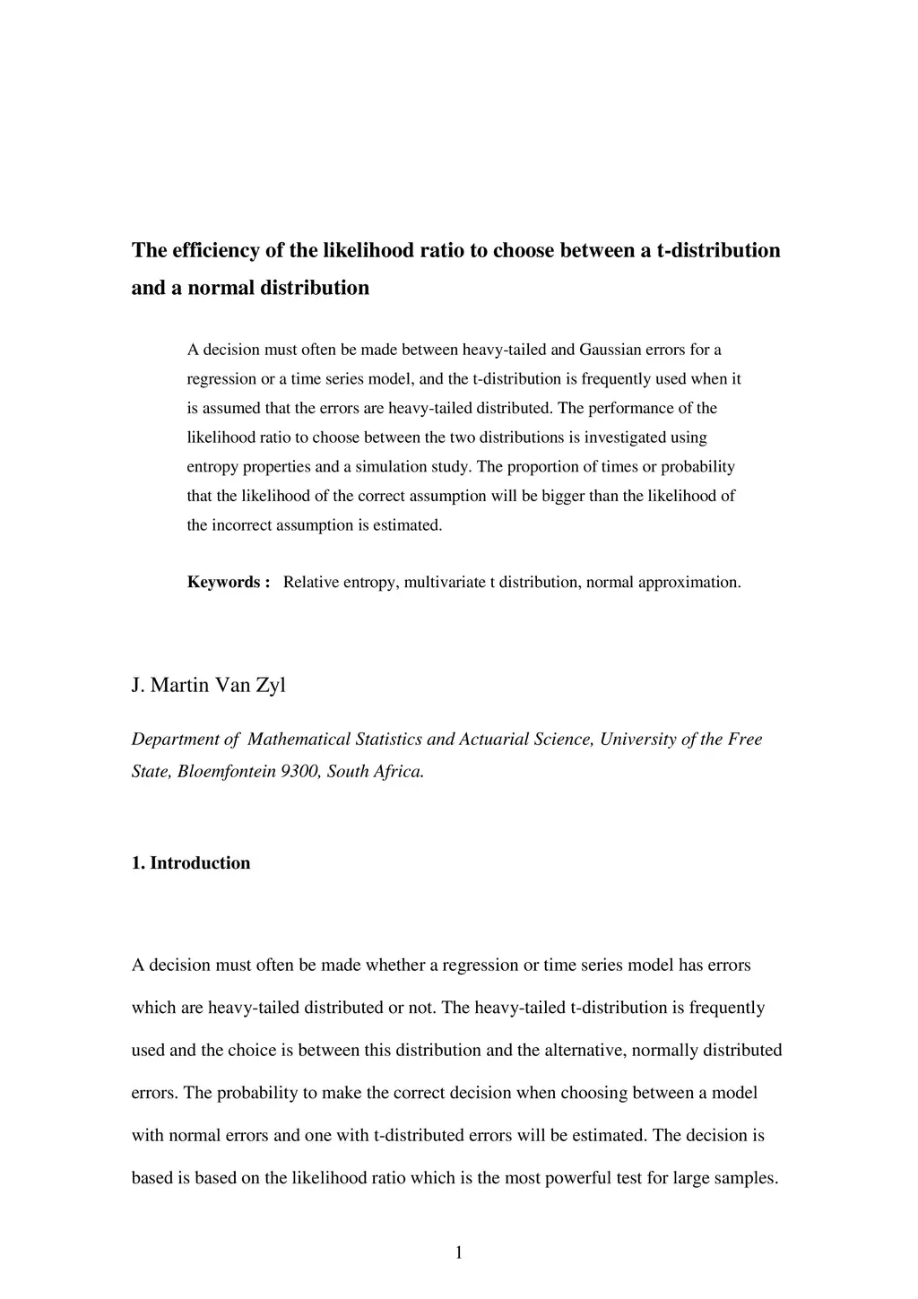 A decision must often be made between heavy-tailed and Gaussian errors for a regression or a time series model, and the t-distribution is frequently used when it is assumed that the errors are heavy-tailed distributed. The performance of the likelihood ratio to choose between the two distributions is investigated using entropy properties and a simulation study. The proportion of times or probability that the likelihood of the correct assumption will be bigger than the likelihood of the incorrect assumption is estimated.