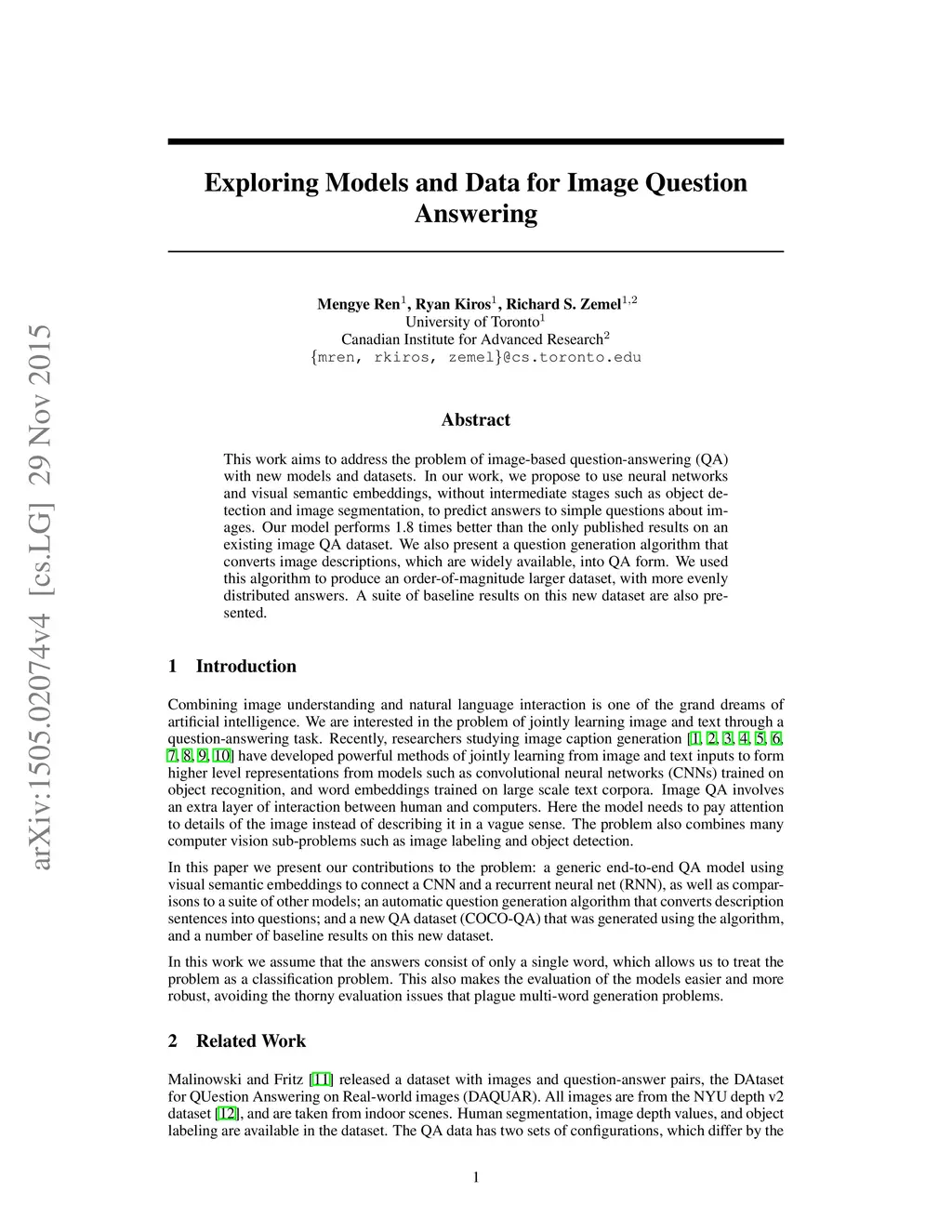 This work aims to address the problem of image-based question-answering (QA) with new models and datasets. In our work, we propose to use neural networks and visual semantic embeddings, without intermediate stages such as object detection and image segmentation, to predict answers to simple questions about images. Our model performs 1.8 times better than the only published results on an existing image QA dataset. We also present a question generation algorithm that converts image descriptions, which are widely available, into QA form. We used this algorithm to produce an order-of-magnitude larger dataset, with more evenly distributed answers. A suite of baseline results on this new dataset are also presented.