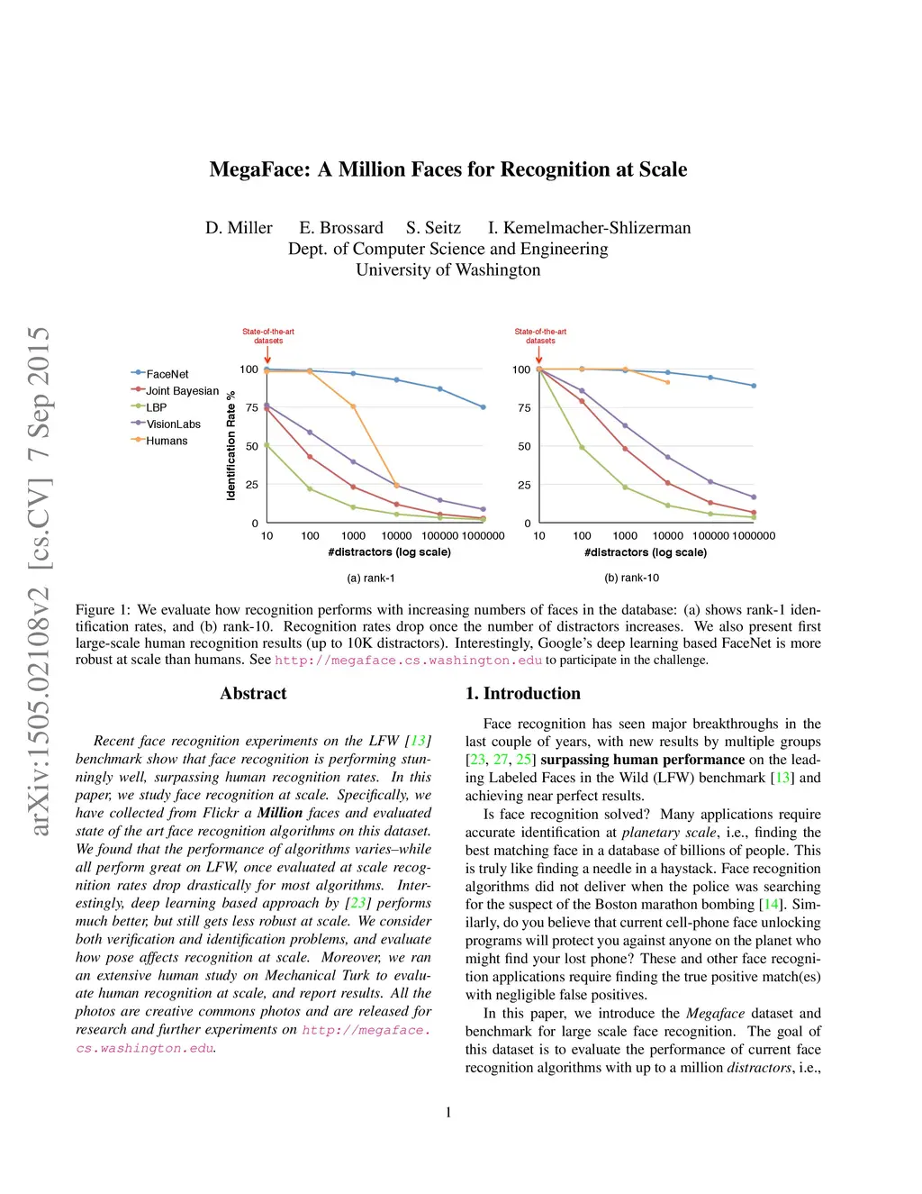 Recent face recognition experiments on the LFW benchmark show that face recognition is performing stunningly well, surpassing human recognition rates. In this paper, we study face recognition at scale. Specifically, we have collected from Flickr a \textbf{Million} faces and evaluated state of the art face recognition algorithms on this dataset. We found that the performance of algorithms varies--while all perform great on LFW, once evaluated at scale recognition rates drop drastically for most algorithms. Interestingly, deep learning based approach by \cite{schroff2015facenet} performs much better, but still gets less robust at scale. We consider both verification and identification problems, and evaluate how pose affects recognition at scale. Moreover, we ran an extensive human study on Mechanical Turk to evaluate human recognition at scale, and report results. All the photos are creative commons photos and is released at \small{\url{http://megaface.cs.washington.edu/}} for research and further experiments.