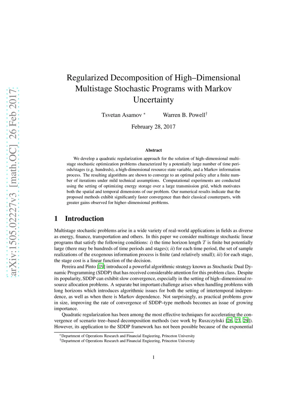 We develop a quadratic regularization approach for the solution of high-dimensional multistage stochastic optimization problems characterized by a potentially large number of time periods/stages (e.g. hundreds), a high-dimensional resource state variable, and a Markov information process. The resulting algorithms are shown to converge to an optimal policy after a finite number of iterations under mild technical assumptions. Computational experiments are conducted using the setting of optimizing energy storage over a large transmission grid, which motivates both the spatial and temporal dimensions of our problem. Our numerical results indicate that the proposed methods exhibit significantly faster convergence than their classical counterparts, with greater gains observed for higher-dimensional problems.