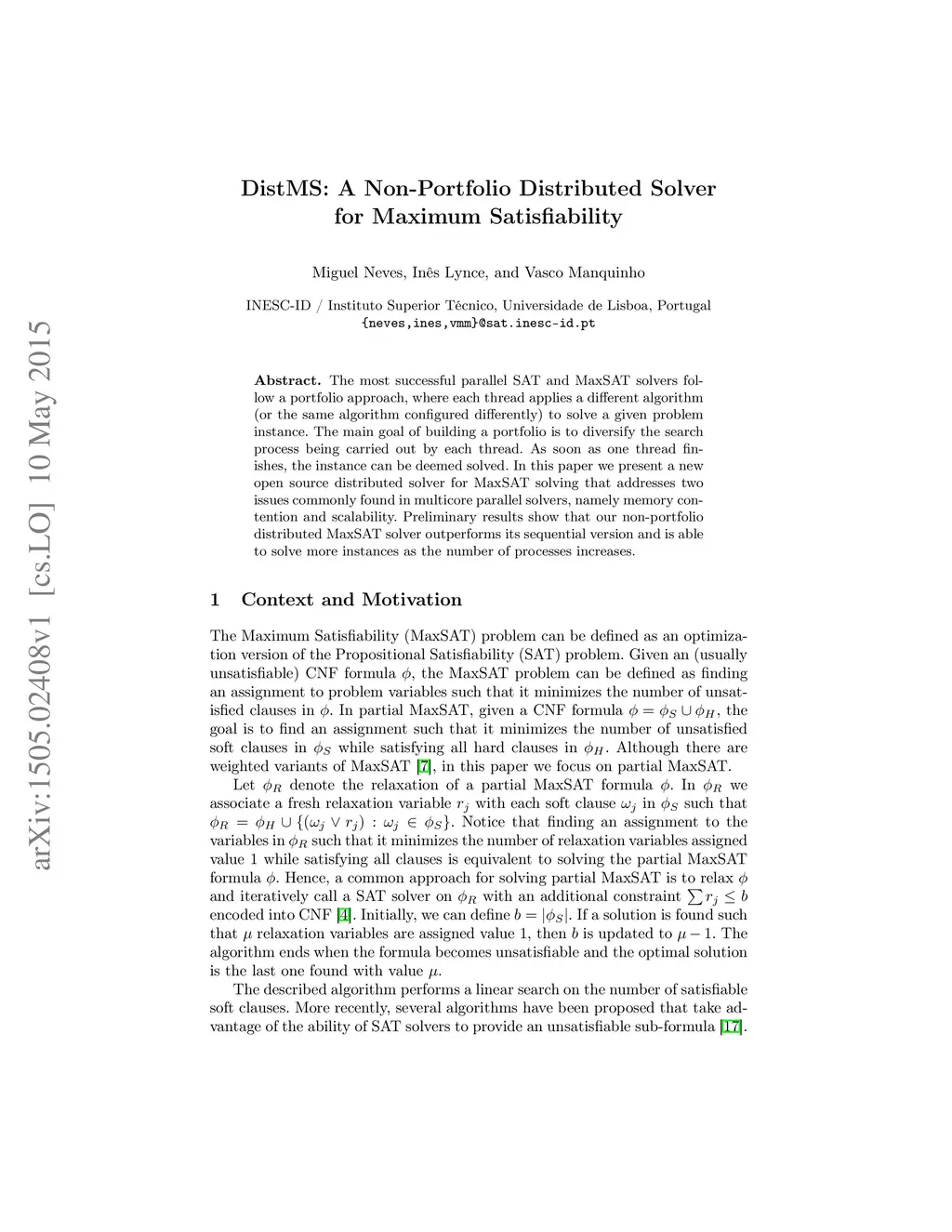 The most successful parallel SAT and MaxSAT solvers follow a portfolio approach, where each thread applies a different algorithm (or the same algorithm configured differently) to solve a given problem instance. The main goal of building a portfolio is to diversify the search process being carried out by each thread. As soon as one thread finishes, the instance can be deemed solved. In this paper we present a new open source distributed solver for MaxSAT solving that addresses two issues commonly found in multicore parallel solvers, namely memory contention and scalability. Preliminary results show that our non-portfolio distributed MaxSAT solver outperforms its sequential version and is able to solve more instances as the number of processes increases.
