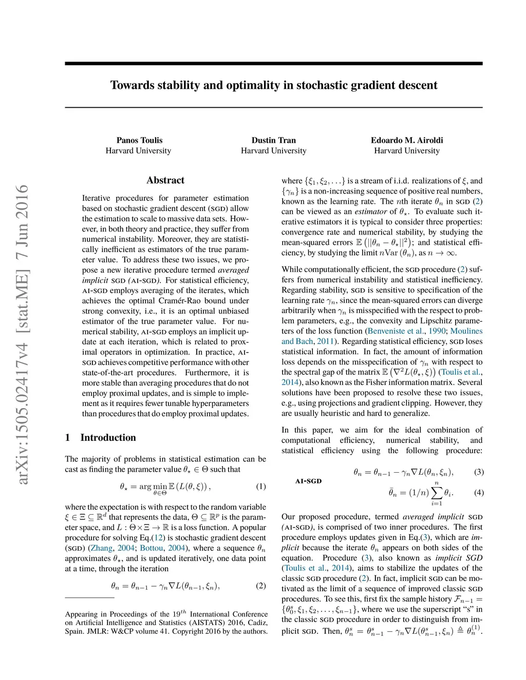 Iterative procedures for parameter estimation based on stochastic gradient descent allow the estimation to scale to massive data sets. However, in both theory and practice, they suffer from numerical instability. Moreover, they are statistically inefficient as estimators of the true parameter value. To address these two issues, we propose a new iterative procedure termed averaged implicit SGD (AI-SGD). For statistical efficiency, AI-SGD employs averaging of the iterates, which achieves the optimal Cram\'{e}r-Rao bound under strong convexity, i.e., it is an optimal unbiased estimator of the true parameter value. For numerical stability, AI-SGD employs an implicit update at each iteration, which is related to proximal operators in optimization. In practice, AI-SGD achieves competitive performance with other state-of-the-art procedures. Furthermore, it is more stable than averaging procedures that do not employ proximal updates, and is simple to implement as it requires fewer tunable hyperparameters than procedures that do employ proximal updates.