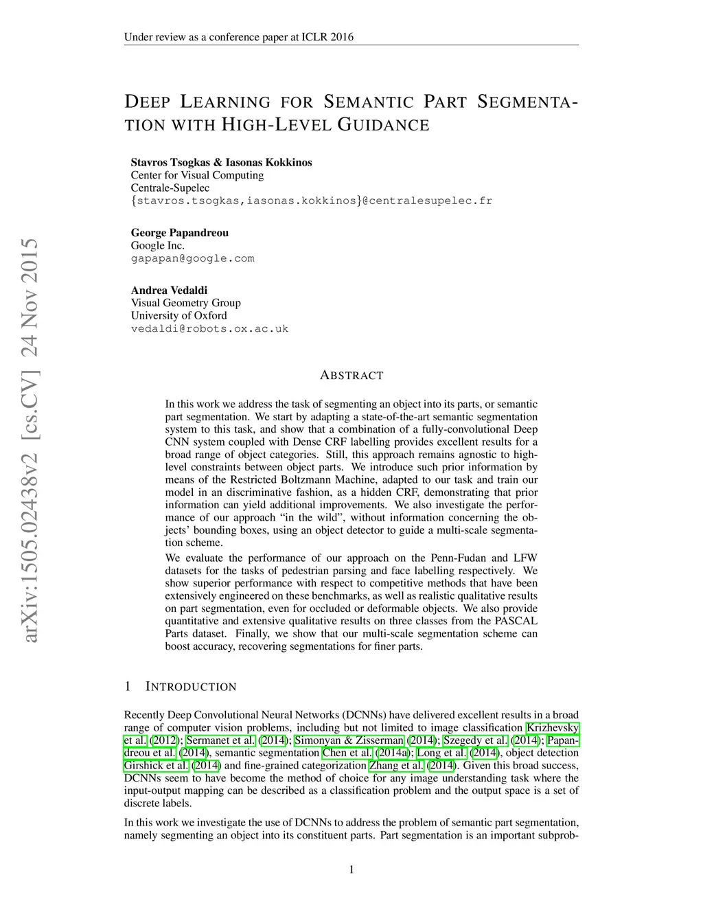Deep Learning for Semantic Part Segmentation with High-Level Guidance