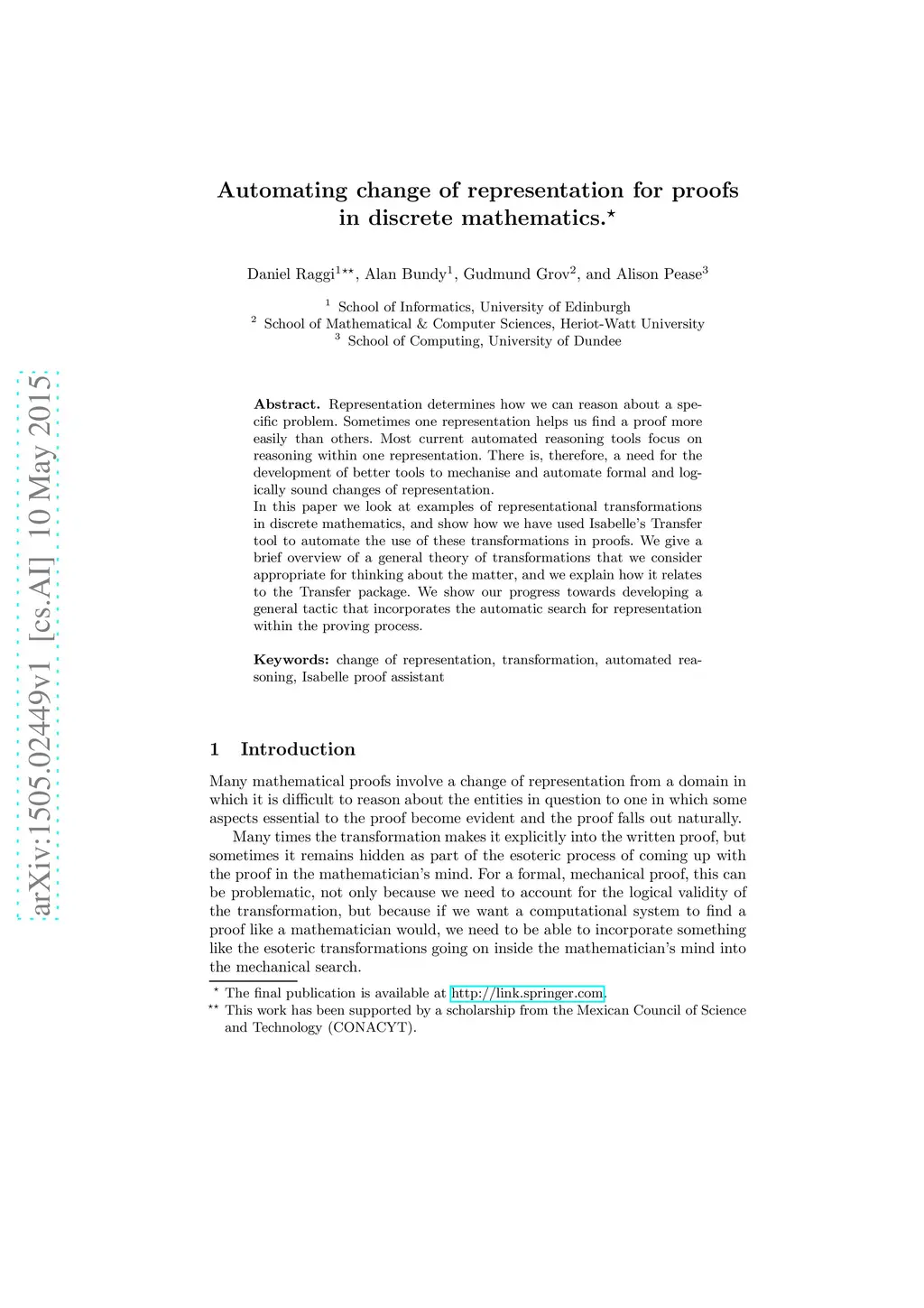 Representation determines how we can reason about a specific problem. Sometimes one representation helps us find a proof more easily than others. Most current automated reasoning tools focus on reasoning within one representation. There is, therefore, a need for the development of better tools to mechanise and automate formal and logically sound changes of representation. In this paper we look at examples of representational transformations in discrete mathematics, and show how we have used Isabelle's Transfer tool to automate the use of these transformations in proofs. We give a brief overview of a general theory of transformations that we consider appropriate for thinking about the matter, and we explain how it relates to the Transfer package. We show our progress towards developing a general tactic that incorporates the automatic search for representation within the proving process.