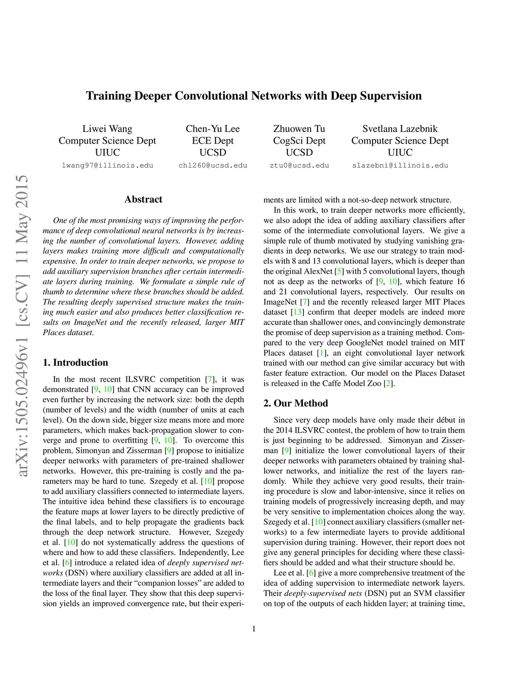 One of the most promising ways of improving the performance of deep convolutional neural networks is by increasing the number of convolutional layers. However, adding layers makes training more difficult and computationally expensive. In order to train deeper networks, we propose to add auxiliary supervision branches after certain intermediate layers during training. We formulate a simple rule of thumb to determine where these branches should be added. The resulting deeply supervised structure makes the training much easier and also produces better classification results on ImageNet and the recently released, larger MIT Places dataset