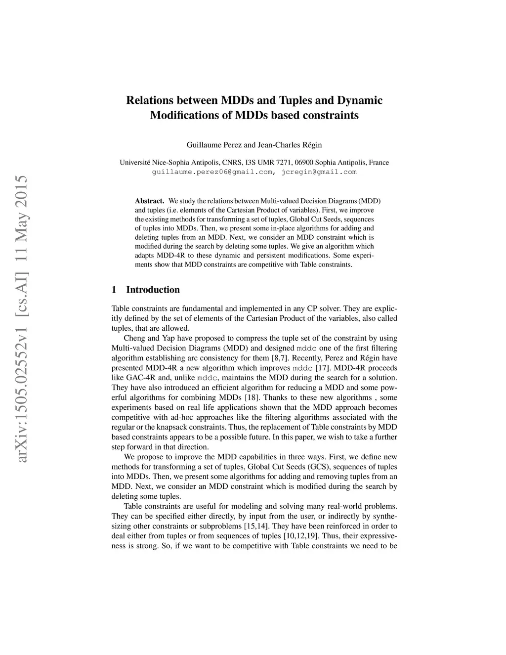 We study the relations between Multi-valued Decision Diagrams (MDD) and tuples (i.e. elements of the Cartesian Product of variables). First, we improve the existing methods for transforming a set of tuples, Global Cut Seeds, sequences of tuples into MDDs. Then, we present some in-place algorithms for adding and deleting tuples from an MDD. Next, we consider an MDD constraint which is modified during the search by deleting some tuples. We give an algorithm which adapts MDD-4R to these dynamic and persistent modifications. Some experiments show that MDD constraints are competitive with Table constraints.