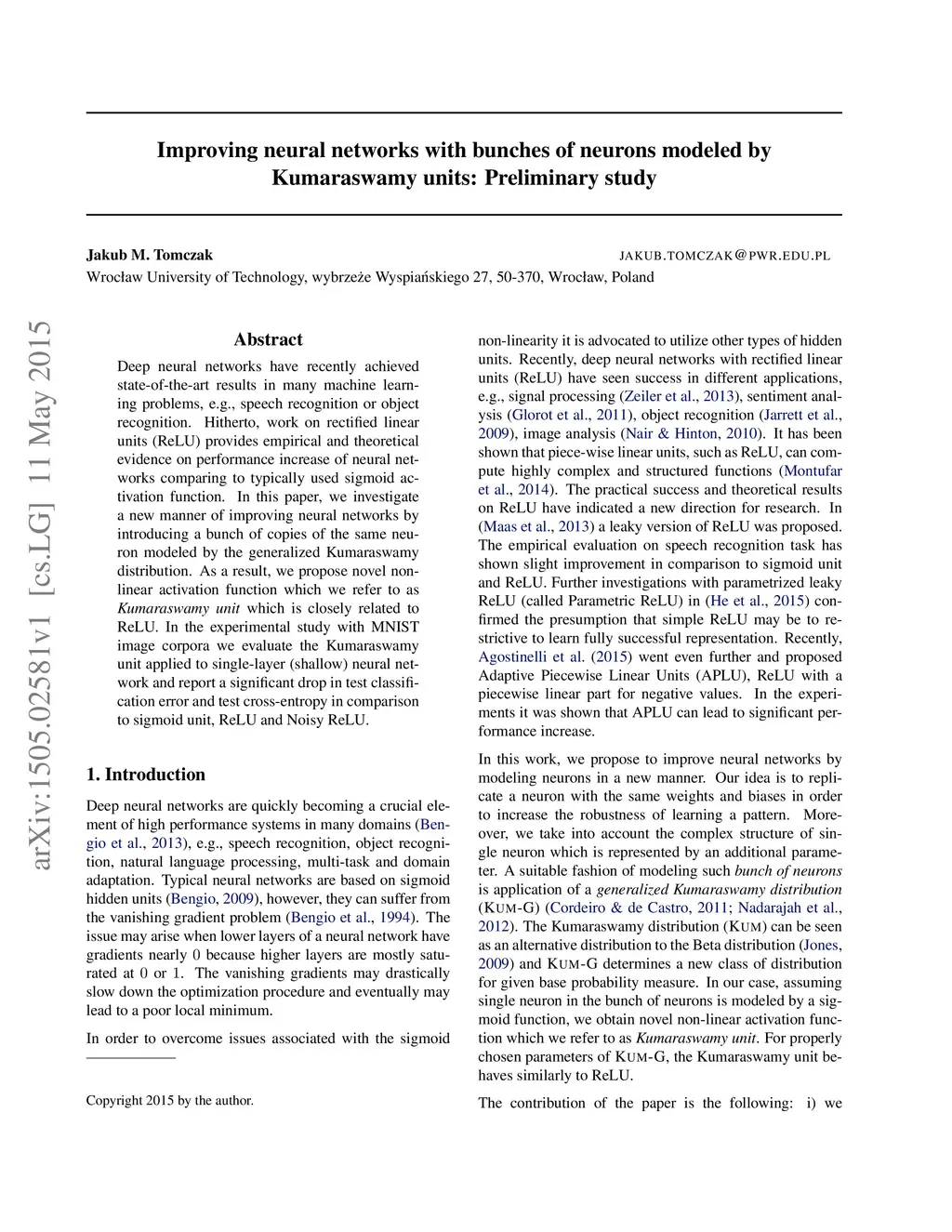 Deep neural networks have recently achieved state-of-the-art results in many machine learning problems, e.g., speech recognition or object recognition. Hitherto, work on rectified linear units (ReLU) provides empirical and theoretical evidence on performance increase of neural networks comparing to typically used sigmoid activation function. In this paper, we investigate a new manner of improving neural networks by introducing a bunch of copies of the same neuron modeled by the generalized Kumaraswamy distribution. As a result, we propose novel non-linear activation function which we refer to as Kumaraswamy unit which is closely related to ReLU. In the experimental study with MNIST image corpora we evaluate the Kumaraswamy unit applied to single-layer (shallow) neural network and report a significant drop in test classification error and test cross-entropy in comparison to sigmoid unit, ReLU and Noisy ReLU.