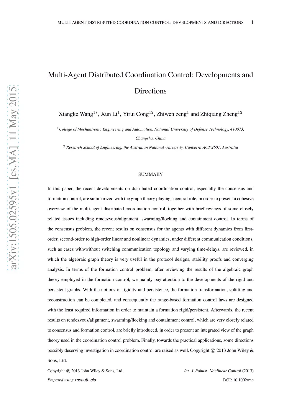In this paper, the recent developments on distributed coordination control, especially the consensus and formation control, are summarized with the graph theory playing a central role, in order to present a cohesive overview of the multi-agent distributed coordination control, together with brief reviews of some closely related issues including rendezvous/alignment, swarming/flocking and containment control.In terms of the consensus problem, the recent results on consensus for the agents with different dynamics from first-order, second-order to high-order linear and nonlinear dynamics, under different communication conditions, such as cases with/without switching communication topology and varying time-delays, are reviewed, in which the algebraic graph theory is very useful in the protocol designs, stability proofs and converging analysis. In terms of the formation control problem, after reviewing the results of the algebraic graph theory employed in the formation control, we mainly pay attention to the developments of the rigid and persistent graphs. With the notions of rigidity and persistence, the formation transformation, splitting and reconstruction can be completed, and consequently the range-based formation control laws are designed with the least required information in order to maintain a formation rigid/persistent. Afterwards, the recent results on rendezvous/alignment, swarming/flocking and containment control, which are very closely related to consensus and formation control, are briefly introduced, in order to present an integrated view of the graph theory used in the coordination control problem. Finally, towards the practical applications, some directions possibly deserving investigation in coordination control are raised as well.