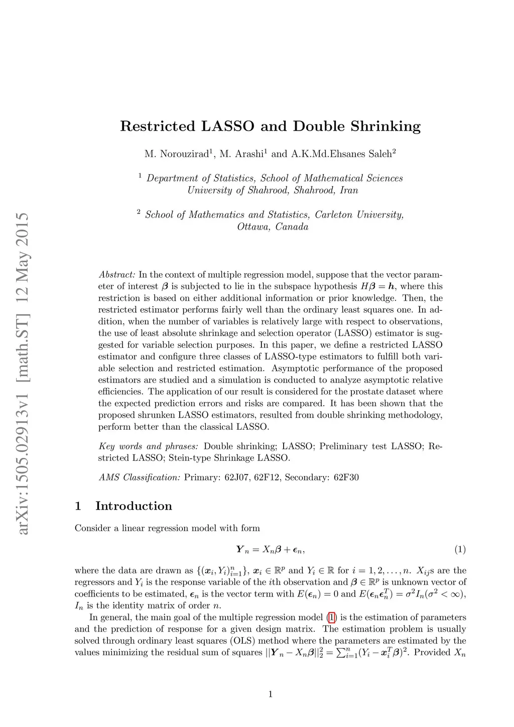 In the context of multiple regression model, suppose that the vector parameter of interest \beta is subjected to lie in the subspace hypothesis H\beta = h, where this restriction is based on either additional information or prior knowledge. Then, the restricted estimator performs fairly well than the ordinary least squares one. In addition, when the number of variables is relatively large with respect to observations, the use of least absolute shrinkage and selection operator (LASSO) estimator is suggested for variable selection purposes. In this paper, we deffine a restricted LASSO estimator and configure three classes of LASSO-type estimators to fulfill both variable selection and restricted estimation. Asymptotic performance of the proposed estimators are studied and a simulation is conducted to analyze asymptotic relative efficiencies. The application of our result is considered for the prostate dataset where the expected prediction errors and risks are compared. It has been shown that the proposed shrunken LASSO estimators, resulted from double shrinking methodology, perform better than the classical LASSO.