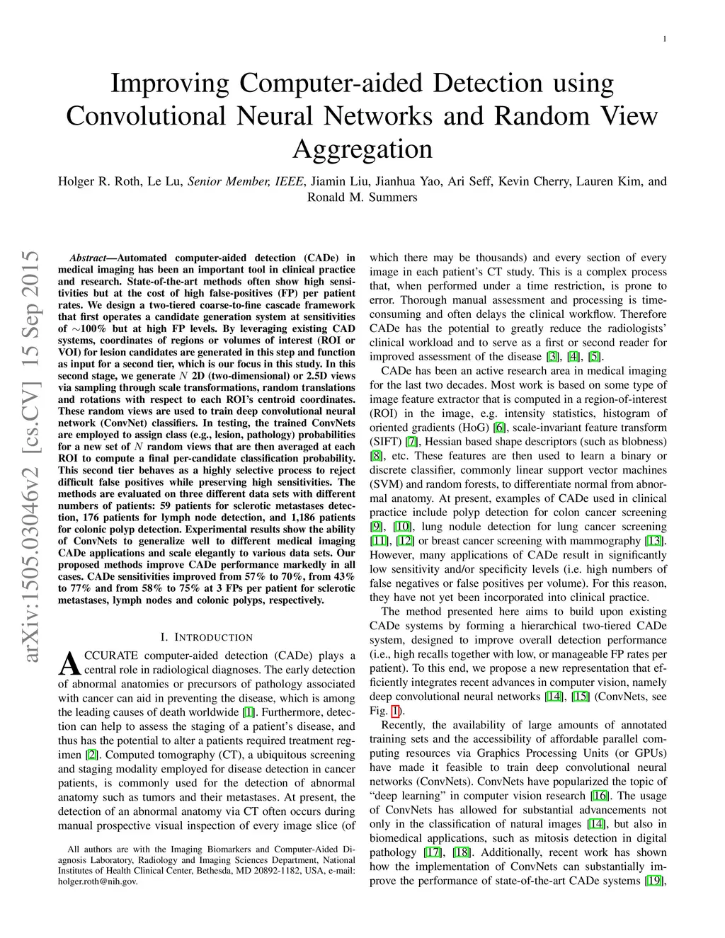 Automated computer-aided detection (CADe) in medical imaging has been an important tool in clinical practice and research. State-of-the-art methods often show high sensitivities but at the cost of high false-positives (FP) per patient rates. We design a two-tiered coarse-to-fine cascade framework that first operates a candidate generation system at sensitivities of 100% but at high FP levels. By leveraging existing CAD systems, coordinates of regions or volumes of interest (ROI or VOI) for lesion candidates are generated in this step and function as input for a second tier, which is our focus in this study. In this second stage, we generate 2D (two-dimensional) or 2.5D views via sampling through scale transformations, random translations and rotations with respect to each ROI's centroid coordinates. These random views are used to train deep convolutional neural network (ConvNet) classifiers. In testing, the trained ConvNets are employed to assign class (e.g., lesion, pathology) probabilities for a new set of random views that are then averaged at each ROI to compute a final per-candidate classification probability. This second tier behaves as a highly selective process to reject difficult false positives while preserving high sensitivities. The methods are evaluated on three different data sets with different numbers of patients: 59 patients for sclerotic metastases detection, 176 patients for lymph node detection, and 1,186 patients for colonic polyp detection. Experimental results show the ability of ConvNets to generalize well to different medical imaging CADe applications and scale elegantly to various data sets. Our proposed methods improve CADe performance markedly in all cases. CADe sensitivities improved from 57% to 70%, from 43% to 77% and from 58% to 75% at 3 FPs per patient for sclerotic metastases, lymph nodes and colonic polyps, respectively.