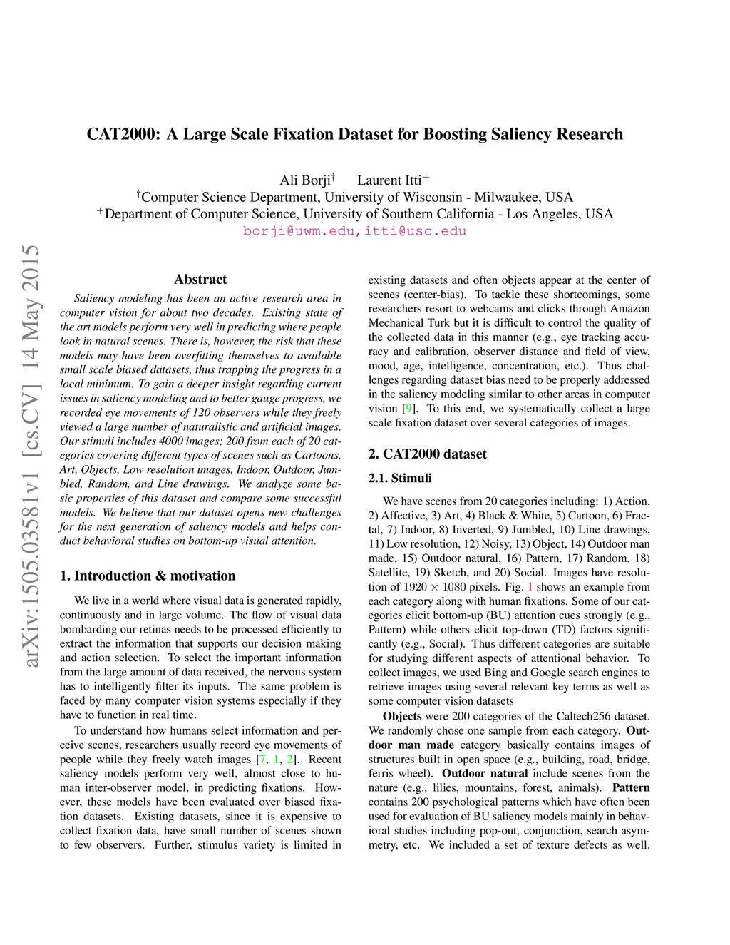 CAT2000: A Large Scale Fixation Dataset for Boosting Saliency Research