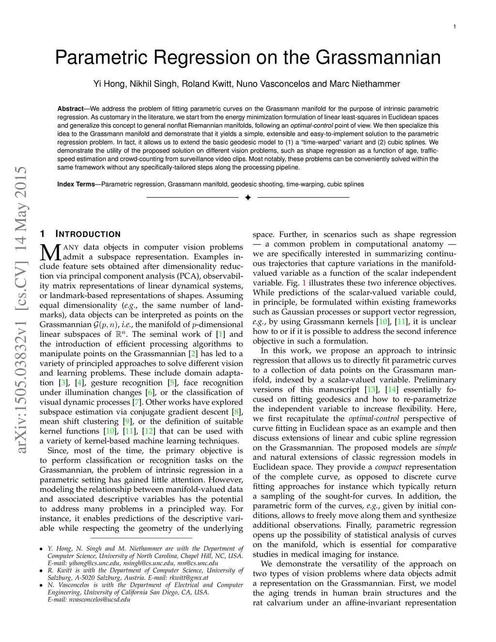 We address the problem of fitting parametric curves on the Grassmann manifold for the purpose of intrinsic parametric regression. As customary in the literature, we start from the energy minimization formulation of linear least-squares in Euclidean spaces and generalize this concept to general nonflat Riemannian manifolds, following an optimal-control point of view. We then specialize this idea to the Grassmann manifold and demonstrate that it yields a simple, extensible and easy-to-implement solution to the parametric regression problem. In fact, it allows us to extend the basic geodesic model to (1) a time-warped variant and (2) cubic splines. We demonstrate the utility of the proposed solution on different vision problems, such as shape regression as a function of age, traffic-speed estimation and crowd-counting from surveillance video clips. Most notably, these problems can be conveniently solved within the same framework without any specifically-tailored steps along the processing pipeline.