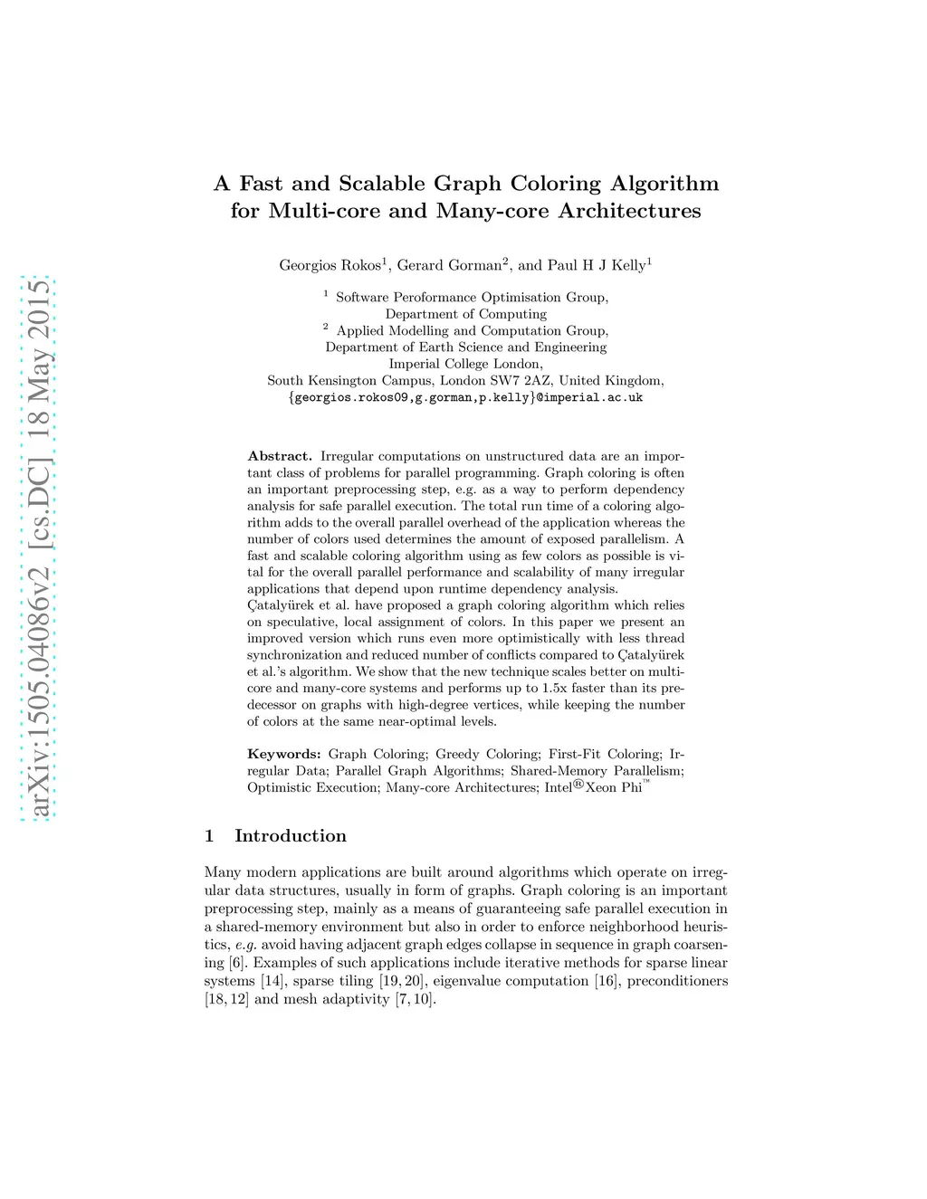Irregular computations on unstructured data are an important class of problems for parallel programming. Graph coloring is often an important preprocessing step, e.g. as a way to perform dependency analysis for safe parallel execution. The total run time of a coloring algorithm adds to the overall parallel overhead of the application whereas the number of colors used determines the amount of exposed parallelism. A fast and scalable coloring algorithm using as few colors as possible is vital for the overall parallel performance and scalability of many irregular applications that depend upon runtime dependency analysis. Catalyurek et al. have proposed a graph coloring algorithm which relies on speculative, local assignment of colors. In this paper we present an improved version which runs even more optimistically with less thread synchronization and reduced number of conflicts compared to Catalyurek et al.'s algorithm. We show that the new technique scales better on multi-core and many-core systems and performs up to 1.5x faster than its predecessor on graphs with high-degree vertices, while keeping the number of colors at the same near-optimal levels.