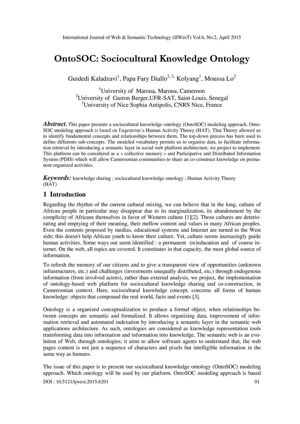 This paper presents a sociocultural knowledge ontology (OntoSOC) modeling approach. OntoSOC modeling approach is based on Engestrom Human Activity Theory (HAT). That Theory allowed us to identify fundamental concepts and relationships between them. The top-down precess has been used to define differents sub-concepts. The modeled vocabulary permits us to organise data, to facilitate information retrieval by introducing a semantic layer in social web platform architecture, we project to implement. This platform can be considered as a collective memory and Participative and Distributed Information System (PDIS) which will allow Cameroonian communities to share an co-construct knowledge on permanent organized activities.