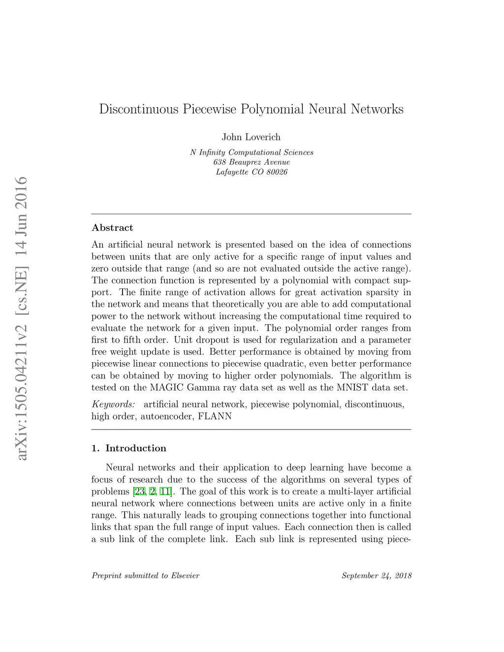 An artificial neural network is presented based on the idea of connections between units that are only active for a specific range of input values and zero outside that range (and so are not evaluated outside the active range). The connection function is represented by a polynomial with compact support. The finite range of activation allows for great activation sparsity in the network and means that theoretically you are able to add computational power to the network without increasing the computational time required to evaluate the network for a given input. The polynomial order ranges from first to fifth order. Unit dropout is used for regularization and a parameter free weight update is used. Better performance is obtained by moving from piecewise linear connections to piecewise quadratic, even better performance can be obtained by moving to higher order polynomials. The algorithm is tested on the MAGIC Gamma ray data set as well as the MNIST data set.