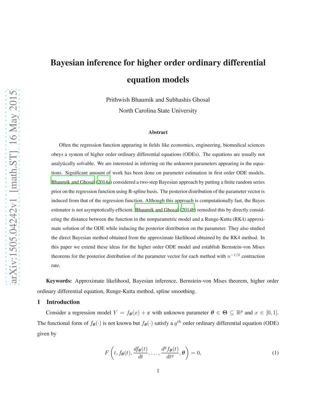 Often the regression function appearing in fields like economics, engineering, biomedical sciences obeys a system of higher order ordinary differential equations (ODEs). The equations are usually not analytically solvable. We are interested in inferring on the unknown parameters appearing in the equations. Significant amount of work has been done on parameter estimation in first order ODE models. Bhaumik and Ghosal (2014a) considered a two-step Bayesian approach by putting a finite random series prior on the regression function using B-spline basis. The posterior distribution of the parameter vector is induced from that of the regression function. Although this approach is computationally fast, the Bayes estimator is not asymptotically efficient. Bhaumik and Ghosal (2014b) remedied this by directly considering the distance between the function in the nonparametric model and a Runge-Kutta (RK) approximate solution of the ODE while inducing the posterior distribution on the parameter. They also studied the direct Bayesian method obtained from the approximate likelihood obtained by the RK4 method. In this paper we extend these ideas for the higher order ODE model and establish Bernstein-von Mises theorems for the posterior distribution of the parameter vector for each method with contraction rate.