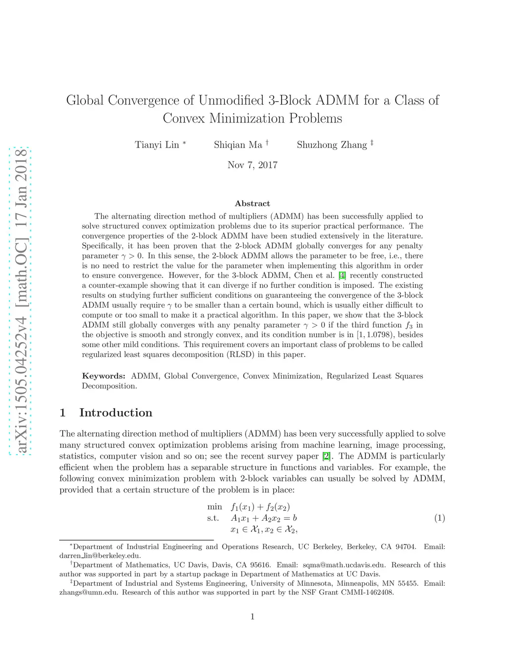 The alternating direction method of multipliers (ADMM) has been successfully applied to solve structured convex optimization problems due to its superior practical performance. The convergence properties of the 2-block ADMM have been studied extensively in the literature. Specifically, it has been proven that the 2-block ADMM globally converges for any penalty parameter . In this sense, the 2-block ADMM allows the parameter to be free, i.e., there is no need to restrict the value for the parameter when implementing this algorithm in order to ensure convergence. However, for the 3-block ADMM, Chen et al. recently constructed a counter-example showing that it can diverge if no further condition is imposed. The existing results on studying further sufficient conditions on guaranteeing the convergence of the 3-block ADMM usually require to be smaller than a certain bound, which is usually either difficult to compute or too small to make it a practical algorithm. In this paper, we show that the 3-block ADMM still globally converges with any penalty parameter when applied to solve a class of commonly encountered problems to be called regularized least squares decomposition (RLSD) in this paper, which covers many important applications in practice.