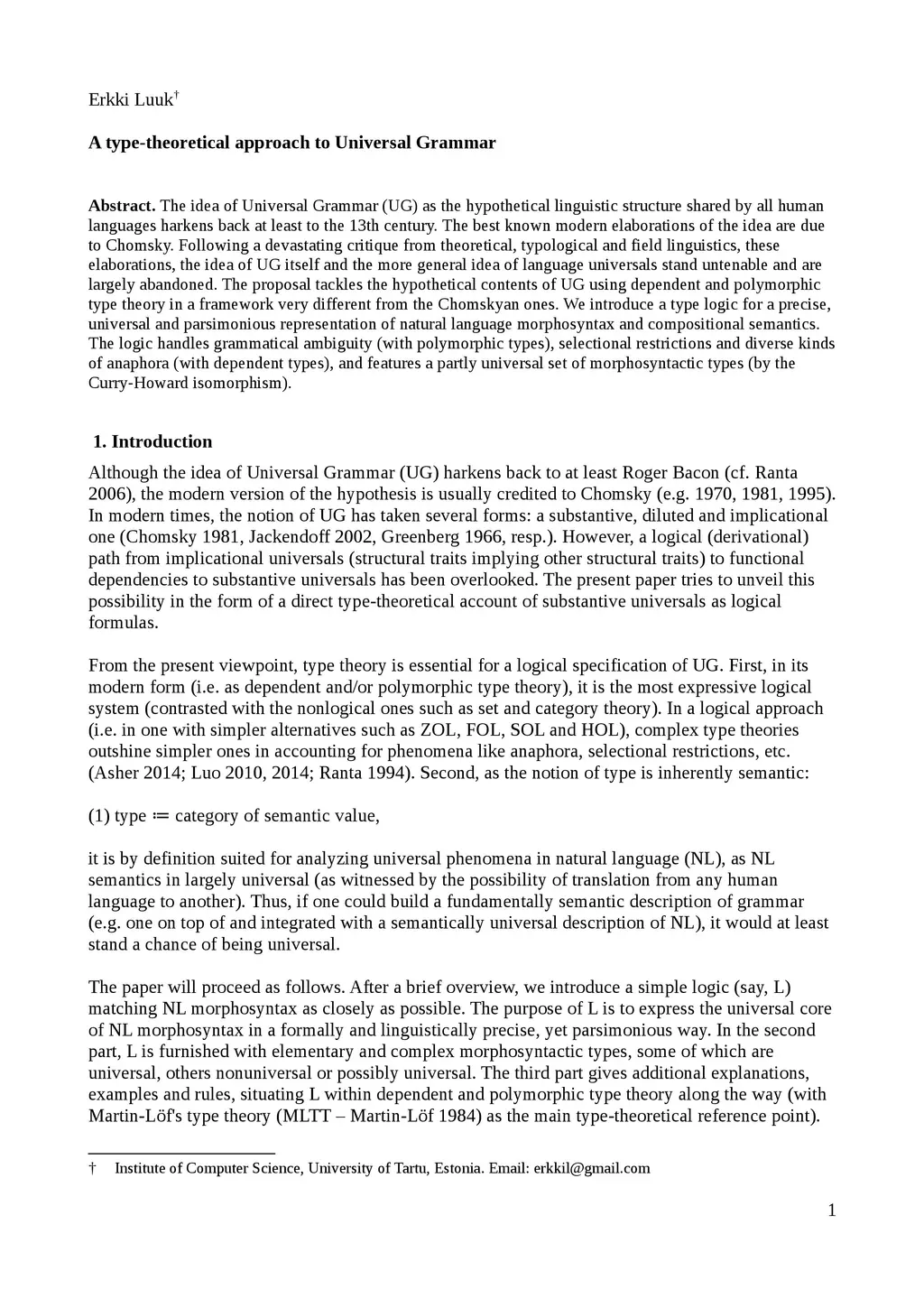 The idea of Universal Grammar (UG) as the hypothetical linguistic structure shared by all human languages harkens back at least to the 13th century. The best known modern elaborations of the idea are due to Chomsky. Following a devastating critique from theoretical, typological and field linguistics, these elaborations, the idea of UG itself and the more general idea of language universals stand untenable and are largely abandoned. The proposal tackles the hypothetical contents of UG using dependent and polymorphic type theory in a framework very different from the Chomskyan ones. We introduce a type logic for a precise, universal and parsimonious representation of natural language morphosyntax and compositional semantics. The logic handles grammatical ambiguity (with polymorphic types), selectional restrictions and diverse kinds of anaphora (with dependent types), and features a partly universal set of morphosyntactic types (by the Curry-Howard isomorphism).