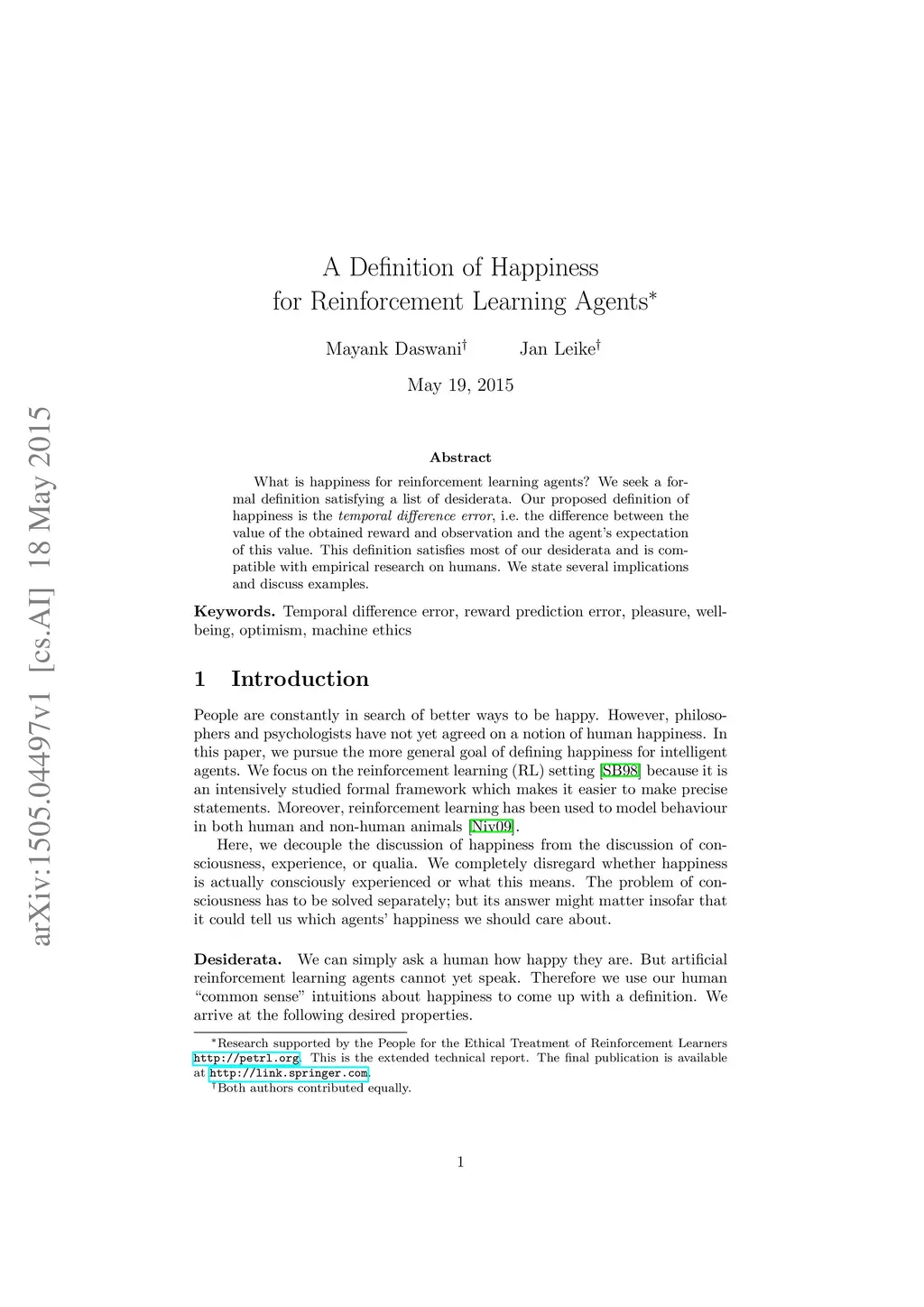 What is happiness for reinforcement learning agents? We seek a formal definition satisfying a list of desiderata. Our proposed definition of happiness is the temporal difference error, i.e. the difference between the value of the obtained reward and observation and the agent's expectation of this value. This definition satisfies most of our desiderata and is compatible with empirical research on humans. We state several implications and discuss examples.