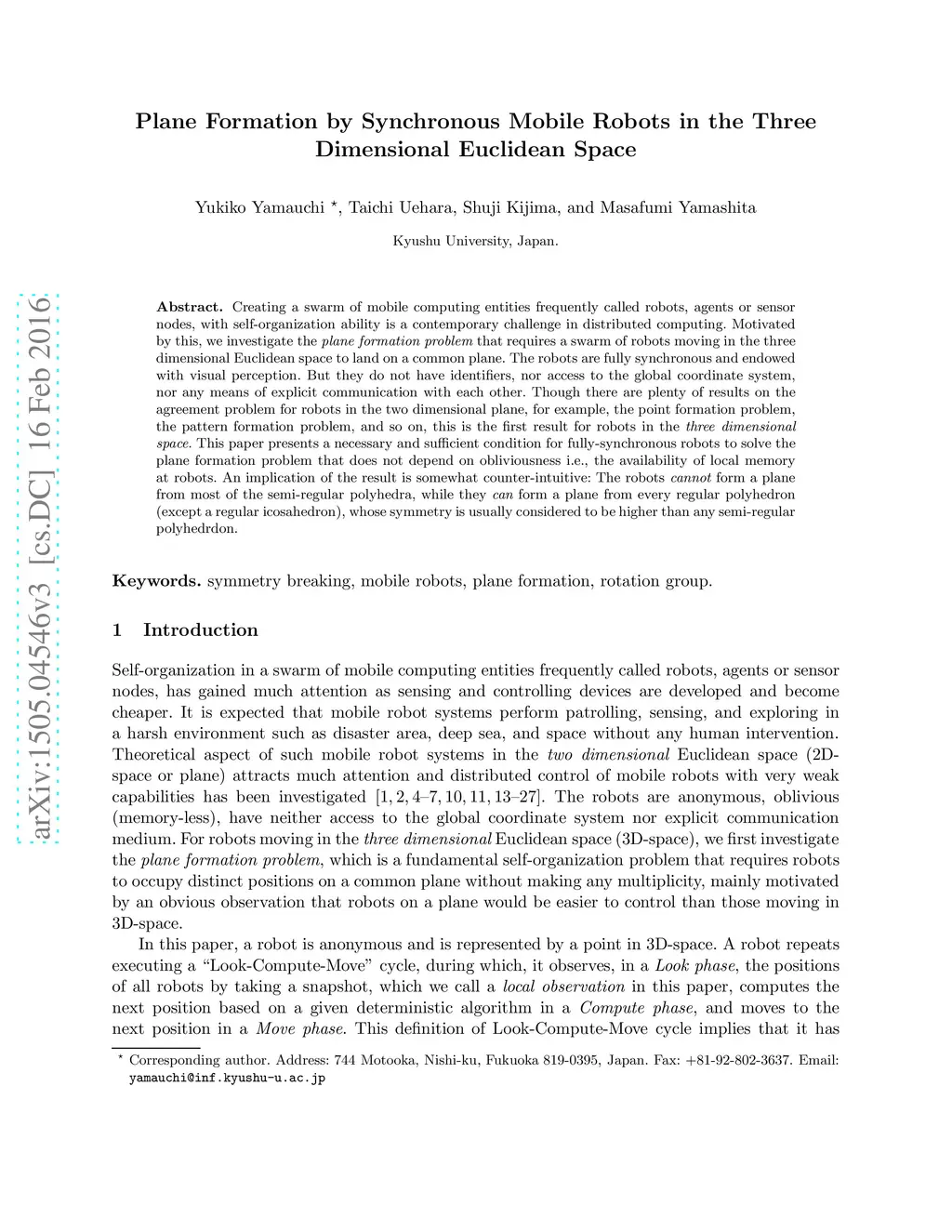 Creating a swarm of mobile computing entities frequently called robots, agents or sensor nodes, with self-organization ability is a contemporary challenge in distributed computing. Motivated by this, this paper investigates the plane formation problem that requires a swarm of robots moving in the three dimensional Euclidean space to reside in a common plane. The robots are fully synchronous and endowed with visual perception. But they have neither identifiers, access to the global coordinate system, any means of explicit communication with each other, nor memory of past. Though there are plenty of results on the agreement problem for robots in the two dimensional plane, for example, the point formation problem, the pattern formation problem, and so on, this is the first result for robots in the three dimensional space. This paper presents a necessary and sufficient condition to solve the plane formation problem. An implication of the result is somewhat counter-intuitive: The robots cannot form a plane from most of the semi-regular polyhedra, while they can from every regular polyhedron (except a regular icosahedron), which consists of the same regular polygon and contains "more" symmetric robots than semi-regular polyhedra.