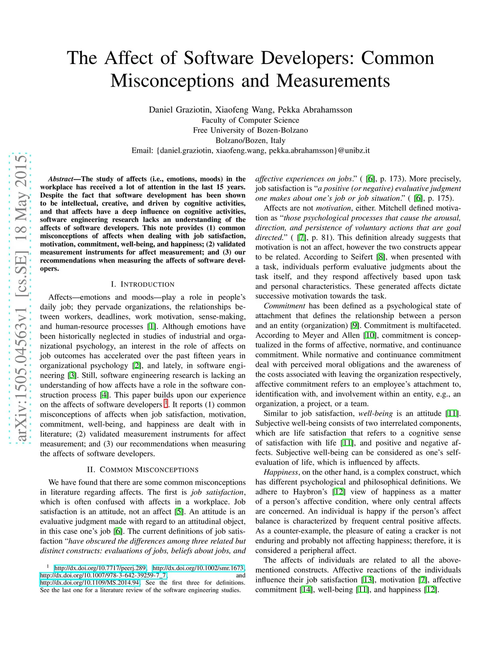 The study of affects (i.e., emotions, moods) in the workplace has received a lot of attention in the last 15 years. Despite the fact that software development has been shown to be intellectual, creative, and driven by cognitive activities, and that affects have a deep influence on cognitive activities, software engineering research lacks an understanding of the affects of software developers. This note provides (1) common misconceptions of affects when dealing with job satisfaction, motivation, commitment, well-being, and happiness; (2) validated measurement instruments for affect measurement; and (3) our recommendations when measuring the affects of software developers.