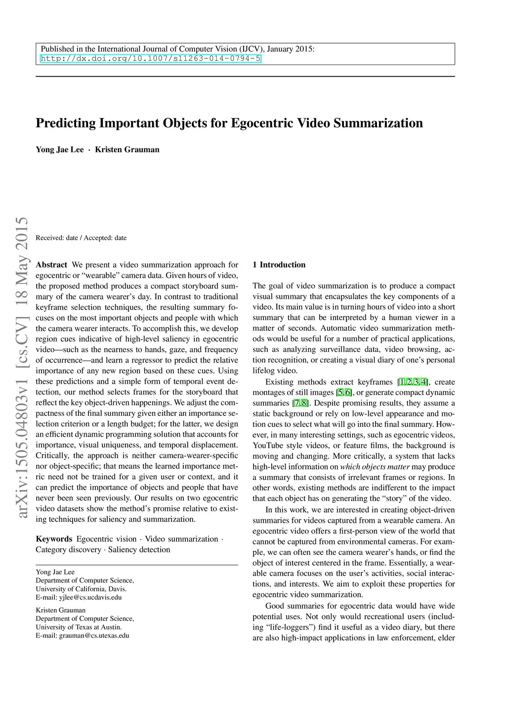 We present a video summarization approach for egocentric or "wearable" camera data. Given hours of video, the proposed method produces a compact storyboard summary of the camera wearer's day. In contrast to traditional keyframe selection techniques, the resulting summary focuses on the most important objects and people with which the camera wearer interacts. To accomplish this, we develop region cues indicative of high-level saliency in egocentric video---such as the nearness to hands, gaze, and frequency of occurrence---and learn a regressor to predict the relative importance of any new region based on these cues. Using these predictions and a simple form of temporal event detection, our method selects frames for the storyboard that reflect the key object-driven happenings. We adjust the compactness of the final summary given either an importance selection criterion or a length budget; for the latter, we design an efficient dynamic programming solution that accounts for importance, visual uniqueness, and temporal displacement. Critically, the approach is neither camera-wearer-specific nor object-specific; that means the learned importance metric need not be trained for a given user or context, and it can predict the importance of objects and people that have never been seen previously. Our results on two egocentric video datasets show the method's promise relative to existing techniques for saliency and summarization.