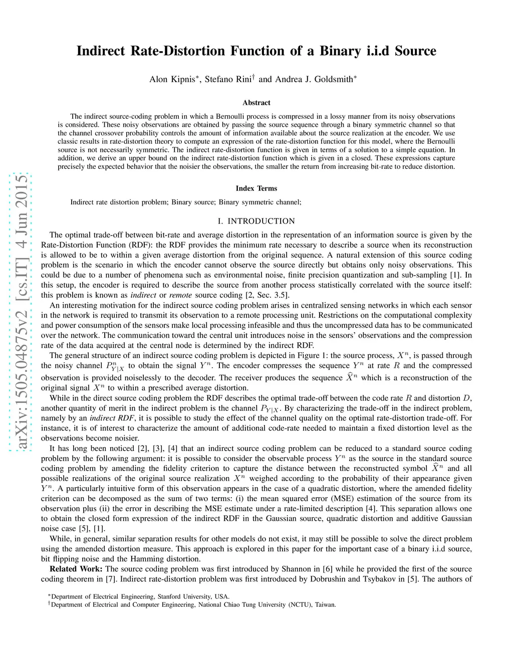 The indirect source-coding problem in which a Bernoulli process is compressed in a lossy manner from its noisy observations is considered. These noisy observations are obtained by passing the source sequence through a The indirect source-coding problem in which a Bernoulli process is compressed in a lossy manner from its noisy observations is considered. These noisy observations are obtained by passing the source sequence through a binary symmetric channel so that the channel crossover probability controls the amount of information available about the source realization at the encoder. We use classic results in rate-distortion theory to compute an expression of the rate-distortion function for this model, where the Bernoulli source is not necessarily symmetric. The indirect rate-distortion function is given in terms of a solution to a simple equation. In addition, we derive an upper bound on the indirect rate-distortion function which is given in a closed. These expressions capture precisely the expected behavior that the noisier the observations, the smaller the return from increasing bit-rate to reduce distortion.