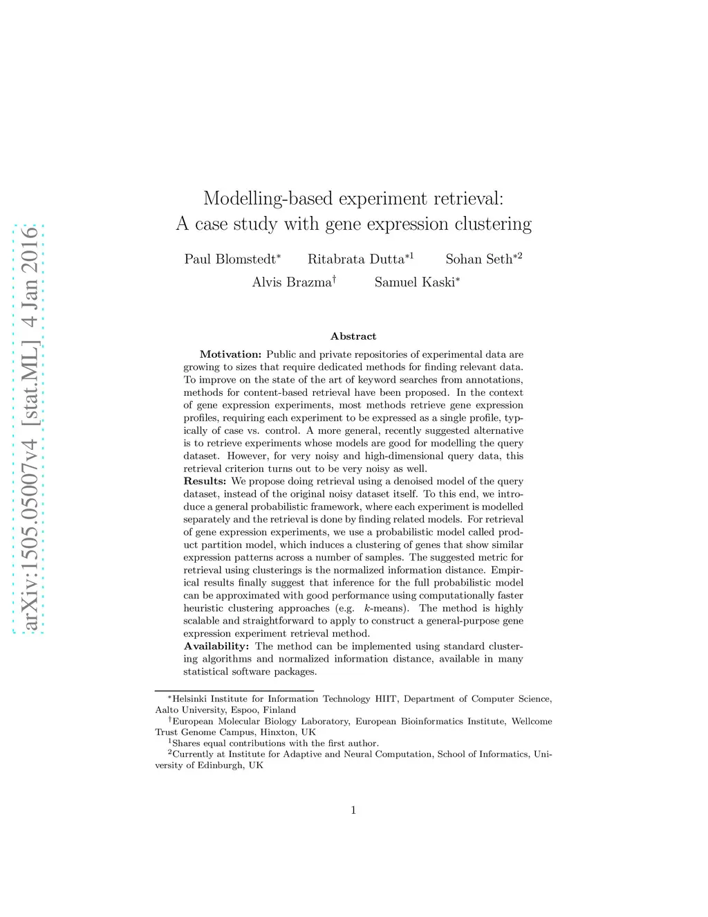 Motivation: Public and private repositories of experimental data are growing to sizes that require dedicated methods for finding relevant data. To improve on the state of the art of keyword searches from annotations, methods for content-based retrieval have been proposed. In the context of gene expression experiments, most methods retrieve gene expression profiles, requiring each experiment to be expressed as a single profile, typically of case vs. control. A more general, recently suggested alternative is to retrieve experiments whose models are good for modelling the query dataset. However, for very noisy and high-dimensional query data, this retrieval criterion turns out to be very noisy as well. Results: We propose doing retrieval using a denoised model of the query dataset, instead of the original noisy dataset itself. To this end, we introduce a general probabilistic framework, where each experiment is modelled separately and the retrieval is done by finding related models. For retrieval of gene expression experiments, we use a probabilistic model called product partition model, which induces a clustering of genes that show similar expression patterns across a number of samples. The suggested metric for retrieval using clusterings is the normalized information distance. Empirical results finally suggest that inference for the full probabilistic model can be approximated with good performance using computationally faster heuristic clustering approaches (e.g. -means). The method is highly scalable and straightforward to apply to construct a general-purpose gene expression experiment retrieval method. Availability: The method can be implemented using standard clustering algorithms and normalized information distance, available in many statistical software packages.