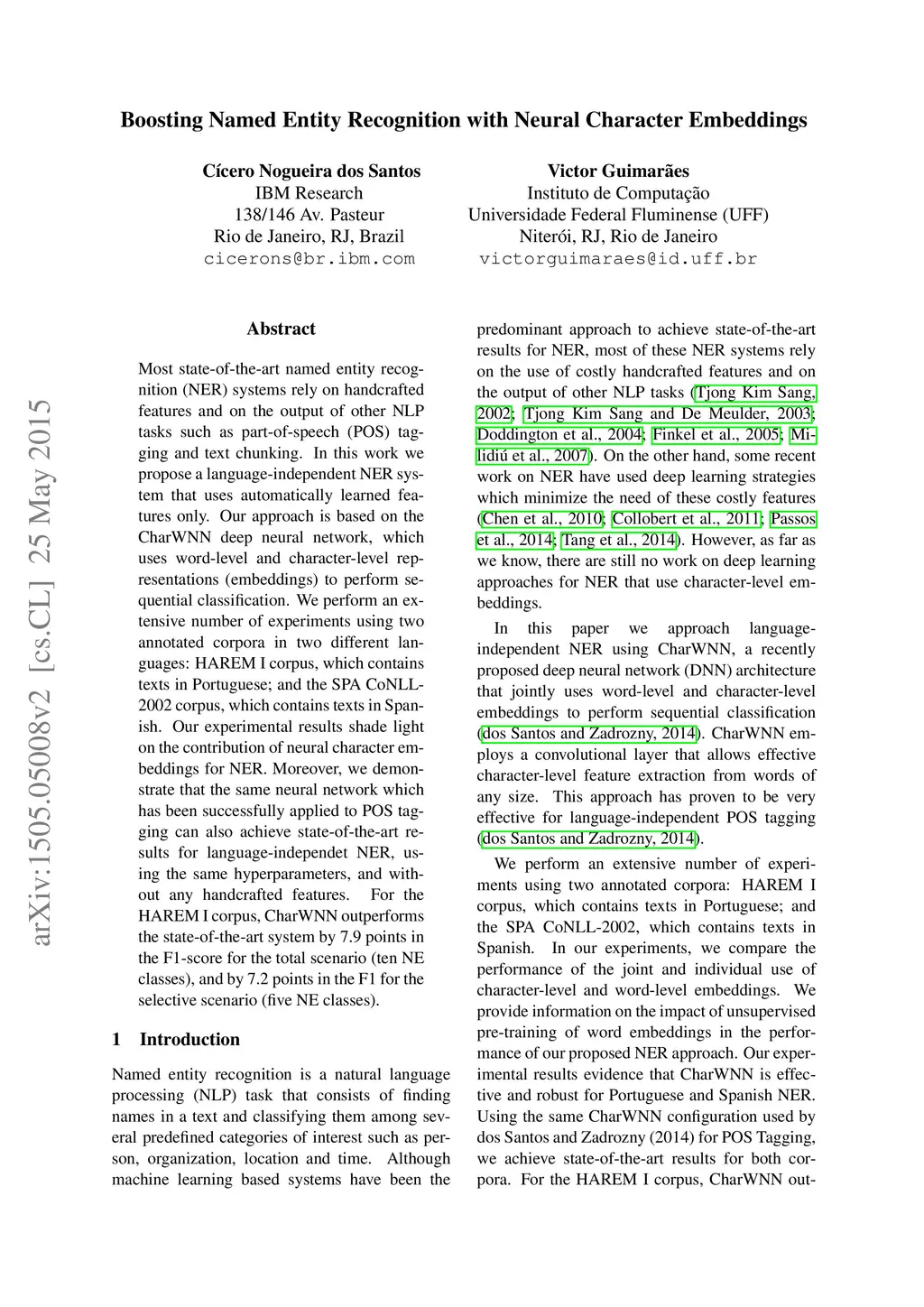 Most state-of-the-art named entity recognition (NER) systems rely on handcrafted features and on the output of other NLP tasks such as part-of-speech (POS) tagging and text chunking. In this work we propose a language-independent NER system that uses automatically learned features only. Our approach is based on the CharWNN deep neural network, which uses word-level and character-level representations (embeddings) to perform sequential classification. We perform an extensive number of experiments using two annotated corpora in two different languages: HAREM I corpus, which contains texts in Portuguese; and the SPA CoNLL-2002 corpus, which contains texts in Spanish. Our experimental results shade light on the contribution of neural character embeddings for NER. Moreover, we demonstrate that the same neural network which has been successfully applied to POS tagging can also achieve state-of-the-art results for language-independet NER, using the same hyperparameters, and without any handcrafted features. For the HAREM I corpus, CharWNN outperforms the state-of-the-art system by 7.9 points in the F1-score for the total scenario (ten NE classes), and by 7.2 points in the F1 for the selective scenario (five NE classes).
