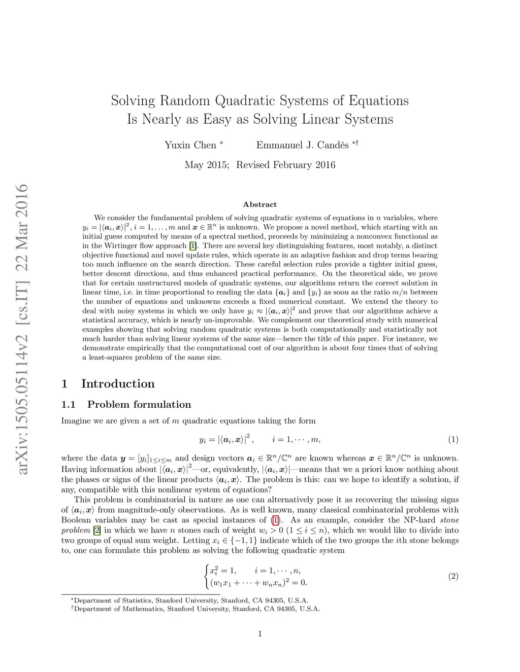 We consider the fundamental problem of solving quadratic systems of equations in variables, where , and is unknown. We propose a novel method, which starting with an initial guess computed by means of a spectral method, proceeds by minimizing a nonconvex functional as in the Wirtinger flow approach. There are several key distinguishing features, most notably, a distinct objective functional and novel update rules, which operate in an adaptive fashion and drop terms bearing too much influence on the search direction. These careful selection rules provide a tighter initial guess, better descent directions, and thus enhanced practical performance. On the theoretical side, we prove that for certain unstructured models of quadratic systems, our algorithms return the correct solution in linear time, i.e. in time proportional to reading the data and as soon as the ratio between the number of equations and unknowns exceeds a fixed numerical constant. We extend the theory to deal with noisy systems in which we only have and prove that our algorithms achieve a statistical accuracy, which is nearly un-improvable. We complement our theoretical study with numerical examples showing that solving random quadratic systems is both computationally and statistically not much harder than solving linear systems of the same size---hence the title of this paper. For instance, we demonstrate empirically that the computational cost of our algorithm is about four times that of solving a least-squares problem of the same size.