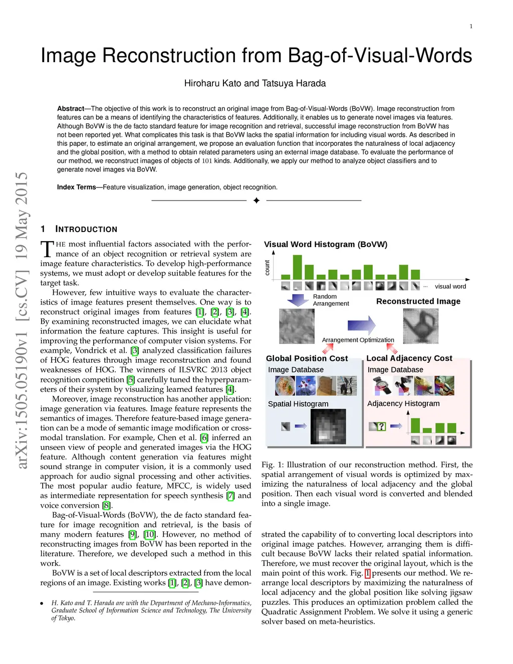 The objective of this work is to reconstruct an original image from Bag-of-Visual-Words (BoVW). Image reconstruction from features can be a means of identifying the characteristics of features. Additionally, it enables us to generate novel images via features. Although BoVW is the de facto standard feature for image recognition and retrieval, successful image reconstruction from BoVW has not been reported yet. What complicates this task is that BoVW lacks the spatial information for including visual words. As described in this paper, to estimate an original arrangement, we propose an evaluation function that incorporates the naturalness of local adjacency and the global position, with a method to obtain related parameters using an external image database. To evaluate the performance of our method, we reconstruct images of objects of 101 kinds. Additionally, we apply our method to analyze object classifiers and to generate novel images via BoVW.