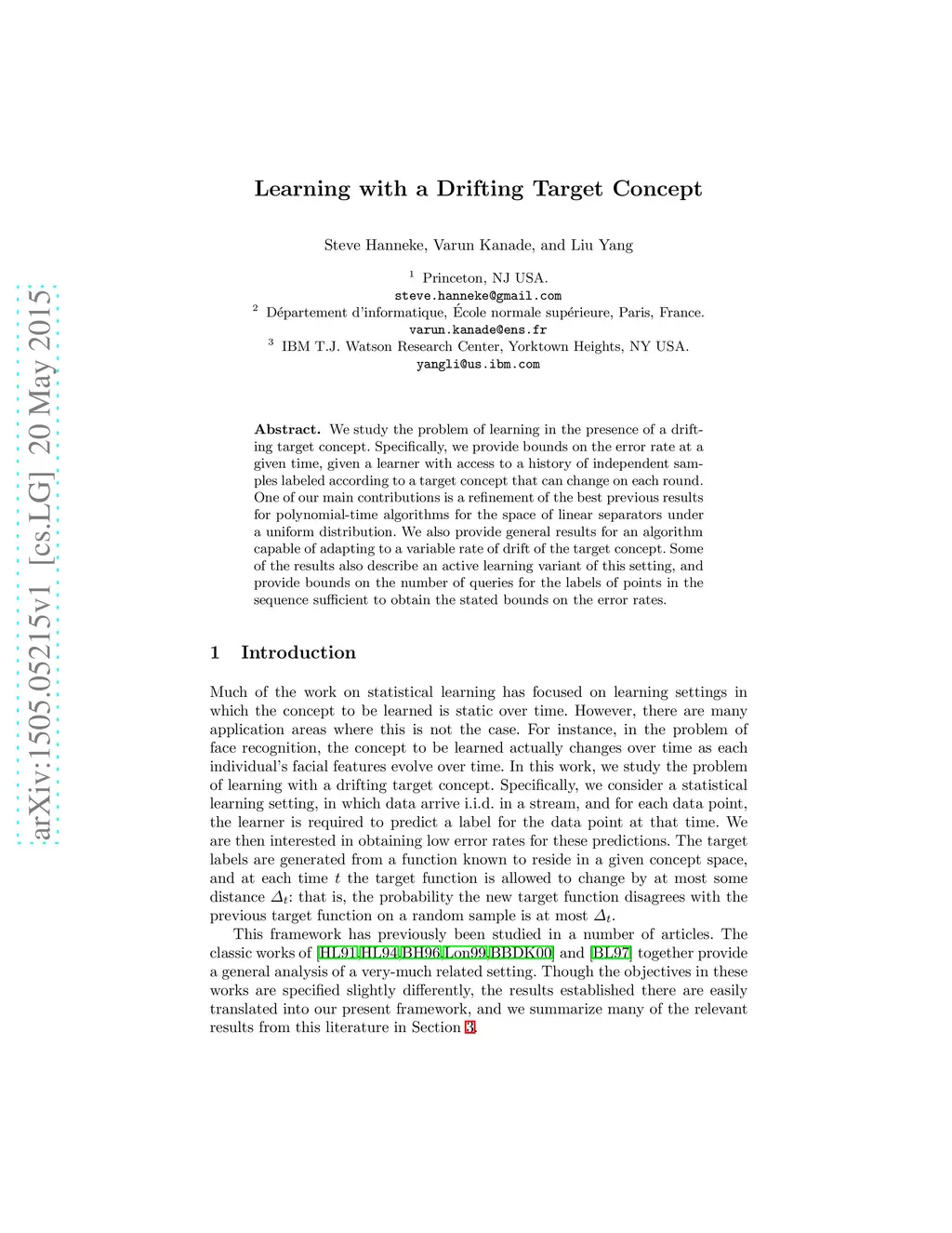 We study the problem of learning in the presence of a drifting target concept. Specifically, we provide bounds on the error rate at a given time, given a learner with access to a history of independent samples labeled according to a target concept that can change on each round. One of our main contributions is a refinement of the best previous results for polynomial-time algorithms for the space of linear separators under a uniform distribution. We also provide general results for an algorithm capable of adapting to a variable rate of drift of the target concept. Some of the results also describe an active learning variant of this setting, and provide bounds on the number of queries for the labels of points in the sequence sufficient to obtain the stated bounds on the error rates.