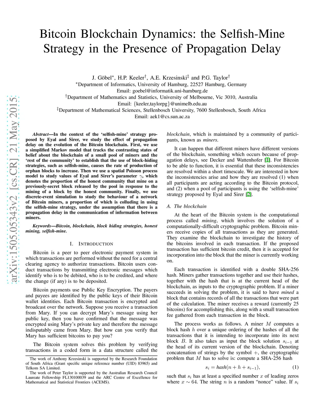 In the context of the `selfish-mine' strategy proposed by Eyal and Sirer, we study the effect of propagation delay on the evolution of the Bitcoin blockchain. First, we use a simplified Markov model that tracks the contrasting states of belief about the blockchain of a small pool of miners and the `rest of the community' to establish that the use of block-hiding strategies, such as selfish-mine, causes the rate of production of orphan blocks to increase. Then we use a spatial Poisson process model to study values of Eyal and Sirer's parameter , which denotes the proportion of the honest community that mine on a previously-secret block released by the pool in response to the mining of a block by the honest community. Finally, we use discrete-event simulation to study the behaviour of a network of Bitcoin miners, a proportion of which is colluding in using the selfish-mine strategy, under the assumption that there is a propagation delay in the communication of information between miners.