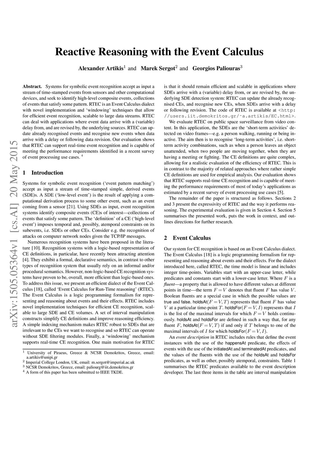 Systems for symbolic event recognition accept as input a stream of time-stamped events from sensors and other computational devices, and seek to identify high-level composite events, collections of events that satisfy some pattern. RTEC is an Event Calculus dialect with novel implementation and 'windowing' techniques that allow for efficient event recognition, scalable to large data streams. RTEC can deal with applications where event data arrive with a (variable) delay from, and are revised by, the underlying sources. RTEC can update already recognised events and recognise new events when data arrive with a delay or following data revision. Our evaluation shows that RTEC can support real-time event recognition and is capable of meeting the performance requirements identified in a recent survey of event processing use cases.