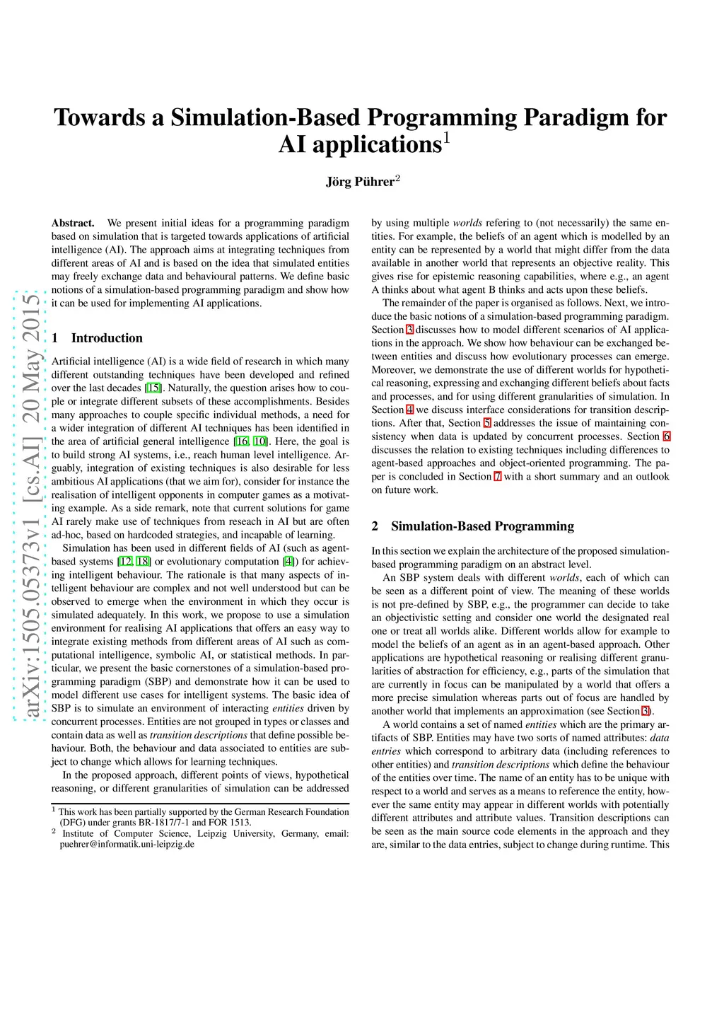 We present initial ideas for a programming paradigm based on simulation that is targeted towards applications of artificial intelligence (AI). The approach aims at integrating techniques from different areas of AI and is based on the idea that simulated entities may freely exchange data and behavioural patterns. We define basic notions of a simulation-based programming paradigm and show how it can be used for implementing AI applications.