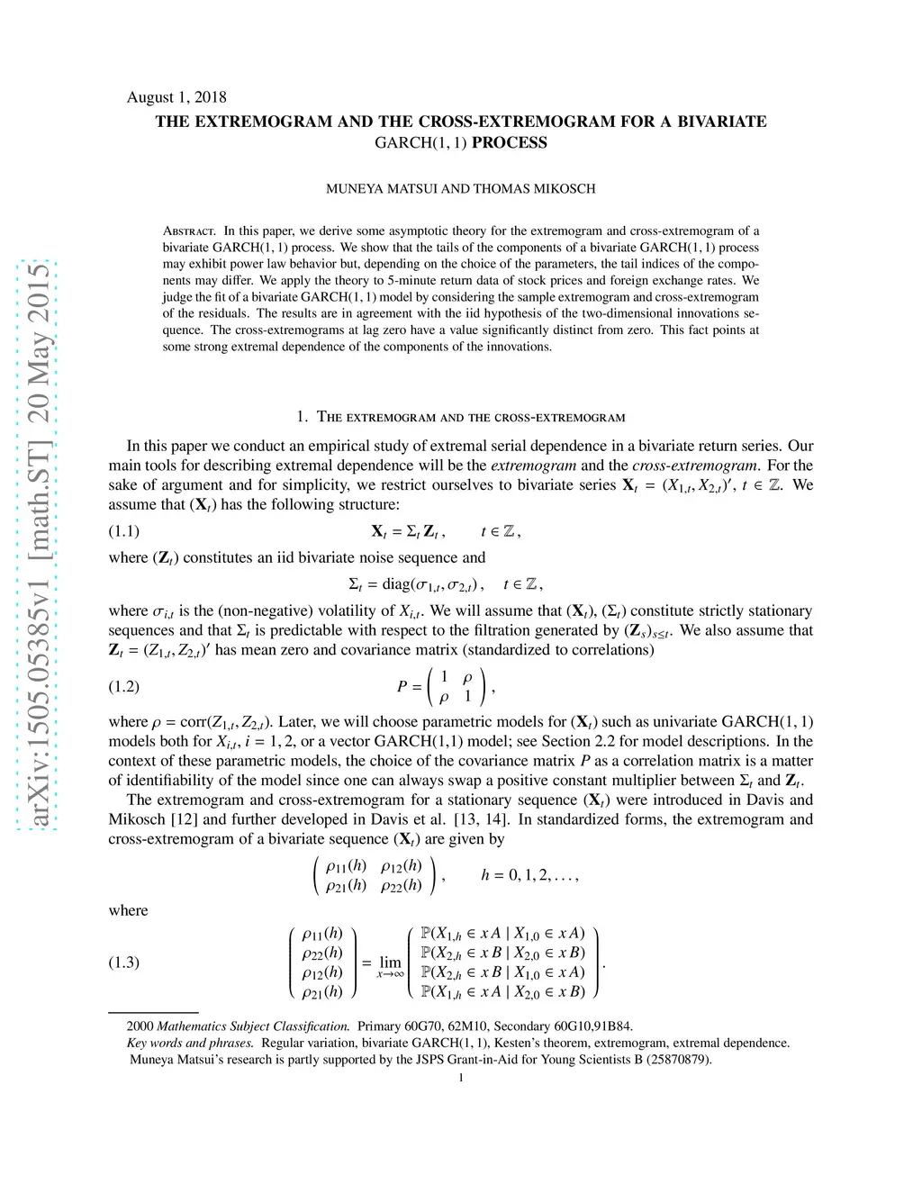 In this paper, we derive some asymptotic theory for the extremogram and cross-extremogram of a bivariate GARCH(1,1) process. We show that the tails of the components of a bivariate GARCH(1,1) process may exhibit power law behavior but, depending on the choice of the parameters, the tail indices of the components may differ. We apply the theory to 5-minute return data of stock prices and foreign exchange rates. We judge the fit of a bivariate GARCH(1,1) model by considering the sample extremogram and cross-extremogram of the residuals. The results are in agreement with the iid hypothesis of the two-dimensional innovations sequence. The cross-extremograms at lag zero have a value significantly distinct from zero. This fact points at some strong extremal dependence of the components of the innovations.