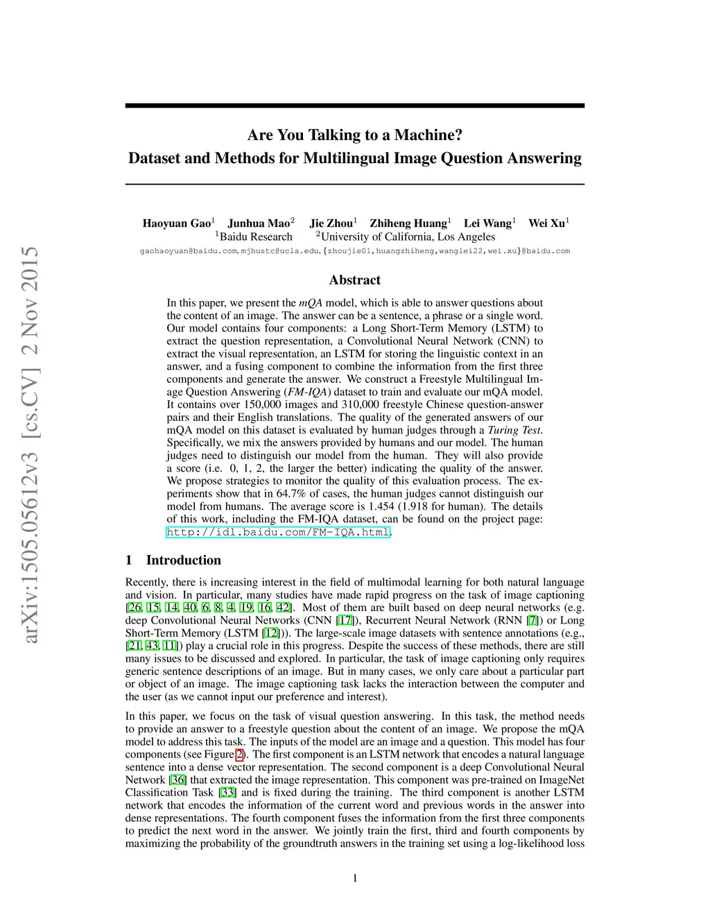 In this paper, we present the mQA model, which is able to answer questions about the content of an image. The answer can be a sentence, a phrase or a single word. Our model contains four components: a Long Short-Term Memory (LSTM) to extract the question representation, a Convolutional Neural Network (CNN) to extract the visual representation, an LSTM for storing the linguistic context in an answer, and a fusing component to combine the information from the first three components and generate the answer. We construct a Freestyle Multilingual Image Question Answering (FM-IQA) dataset to train and evaluate our mQA model. It contains over 150,000 images and 310,000 freestyle Chinese question-answer pairs and their English translations. The quality of the generated answers of our mQA model on this dataset is evaluated by human judges through a Turing Test. Specifically, we mix the answers provided by humans and our model. The human judges need to distinguish our model from the human. They will also provide a score (i.e. 0, 1, 2, the larger the better) indicating the quality of the answer. We propose strategies to monitor the quality of this evaluation process. The experiments show that in 64.7% of cases, the human judges cannot distinguish our model from humans. The average score is 1.454 (1.918 for human). The details of this work, including the FM-IQA dataset, can be found on the project page: http://idl.baidu.com/FM-IQA.html