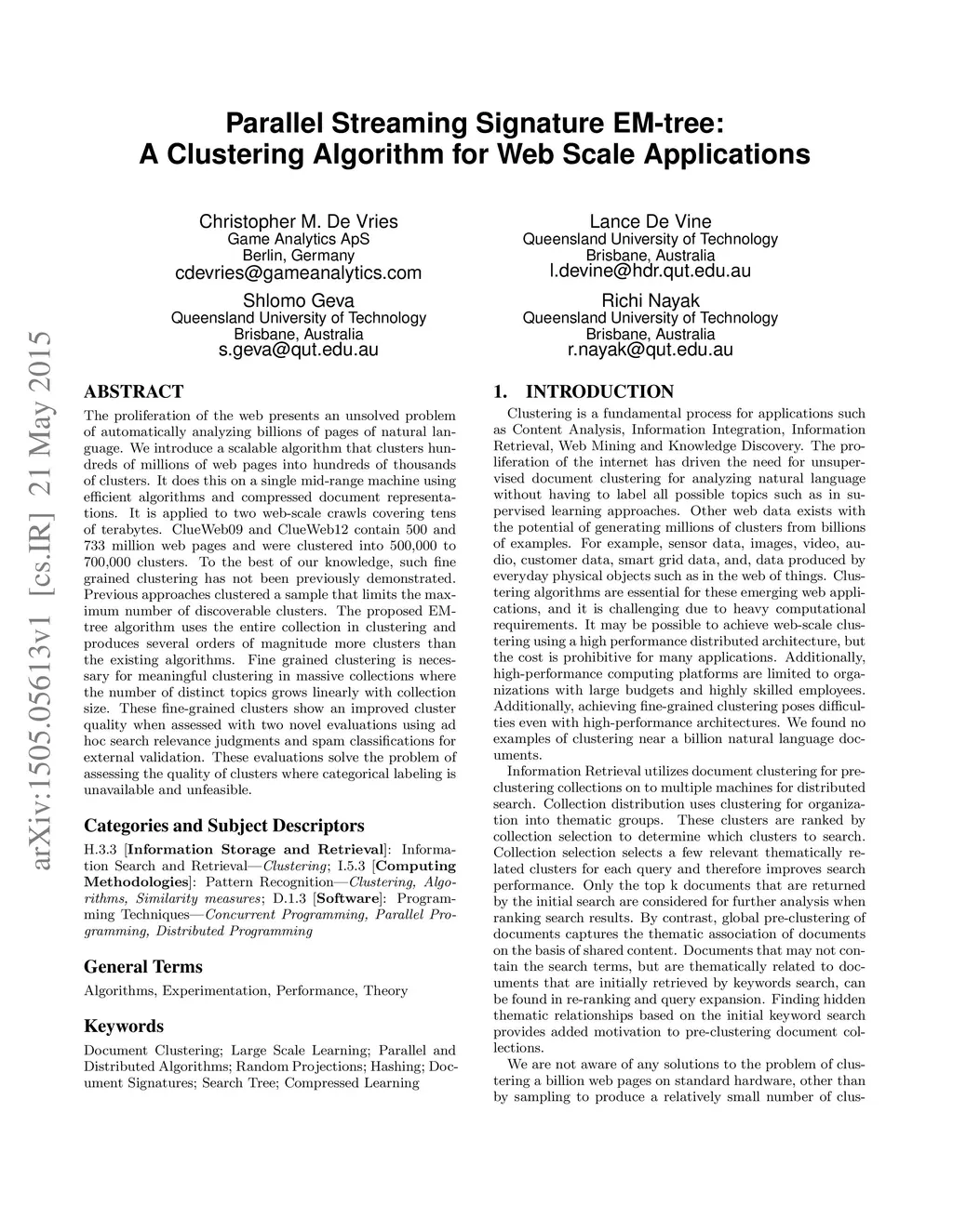 Parallel Streaming Signature EM-tree: A Clustering Algorithm for Web