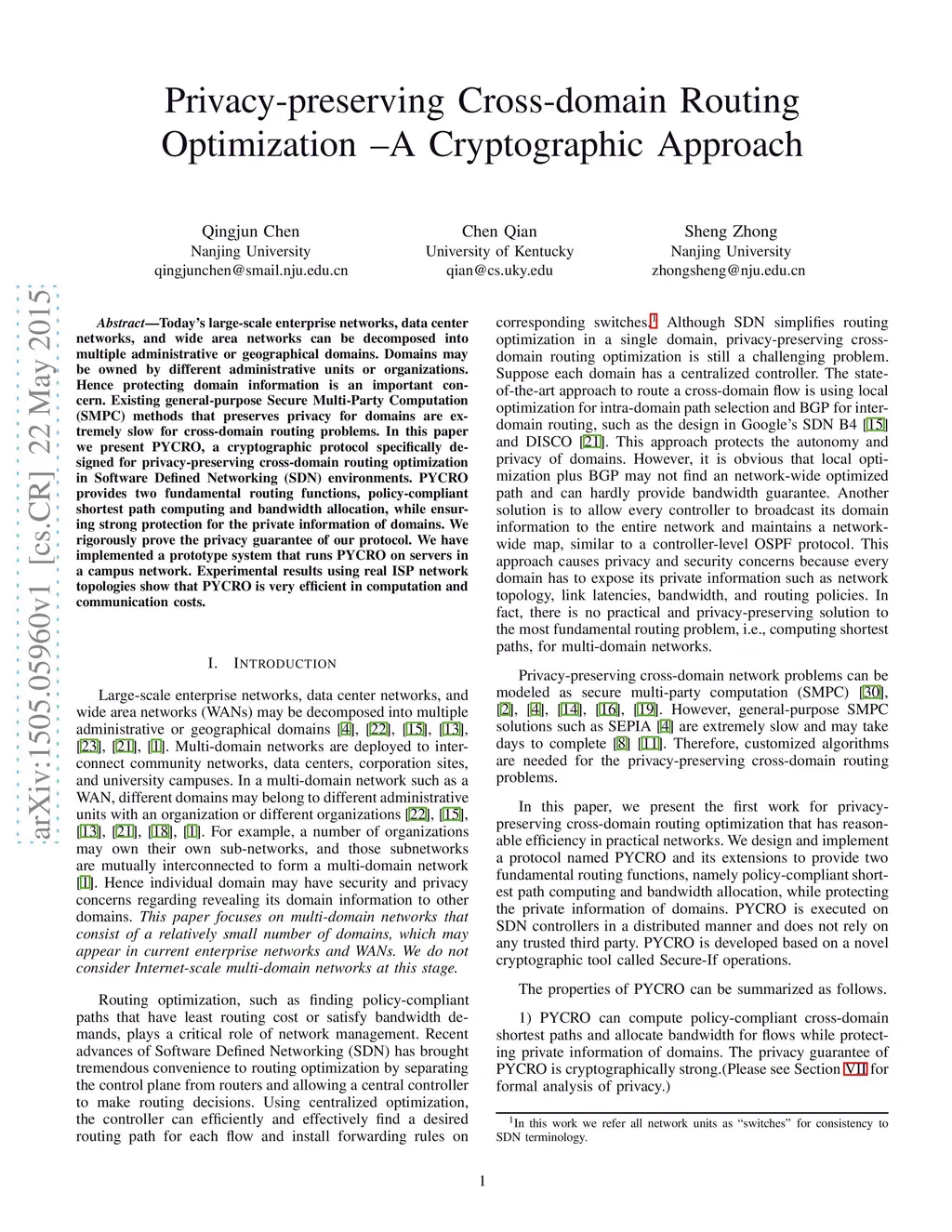Today's large-scale enterprise networks, data center networks, and wide area networks can be decomposed into multiple administrative or geographical domains. Domains may be owned by different administrative units or organizations. Hence protecting domain information is an important concern. Existing general-purpose Secure Multi-Party Computation (SMPC) methods that preserves privacy for domains are extremely slow for cross-domain routing problems. In this paper we present PYCRO, a cryptographic protocol specifically designed for privacy-preserving cross-domain routing optimization in Software Defined Networking (SDN) environments. PYCRO provides two fundamental routing functions, policy-compliant shortest path computing and bandwidth allocation, while ensuring strong protection for the private information of domains. We rigorously prove the privacy guarantee of our protocol. We have implemented a prototype system that runs PYCRO on servers in a campus network. Experimental results using real ISP network topologies show that PYCRO is very efficient in computation and communication costs.