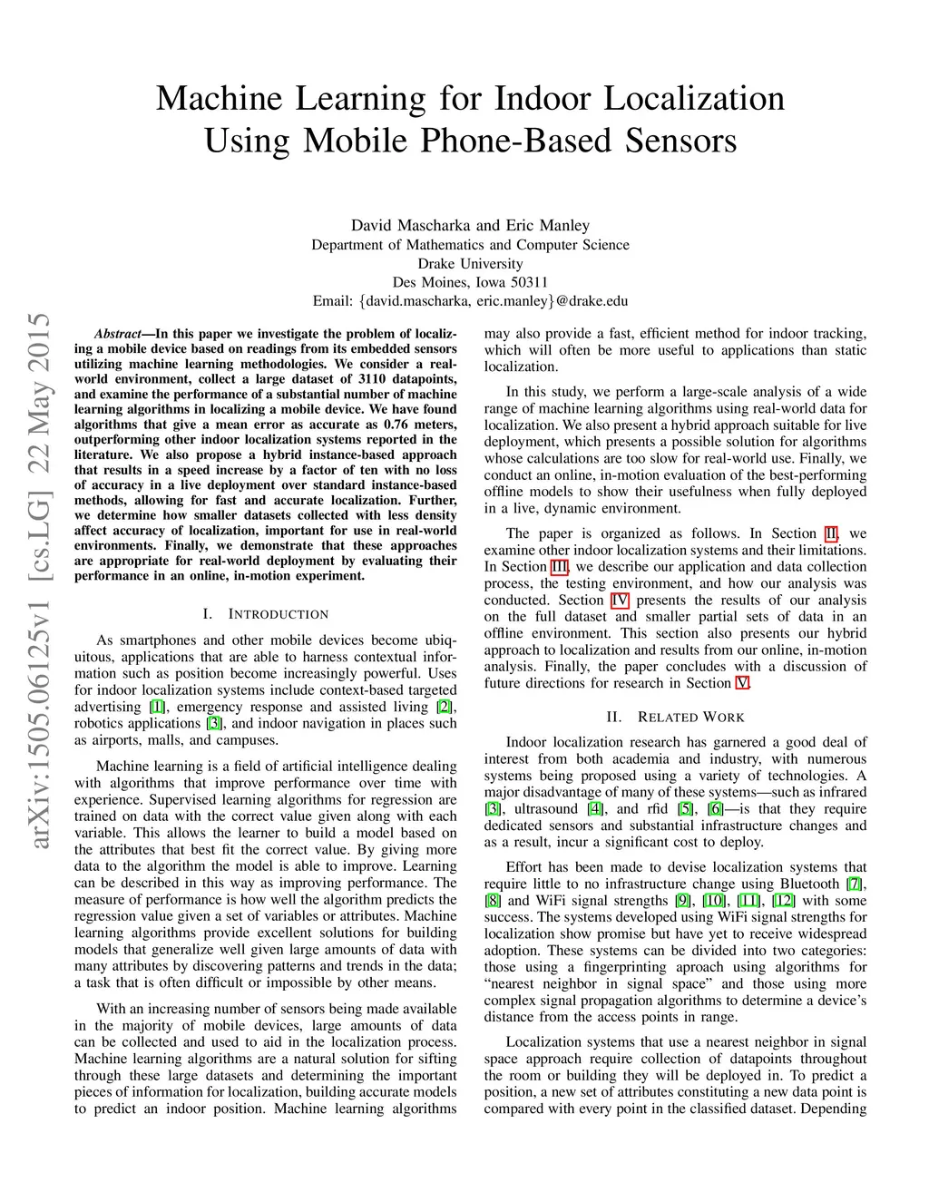 In this paper we investigate the problem of localizing a mobile device based on readings from its embedded sensors utilizing machine learning methodologies. We consider a real-world environment, collect a large dataset of 3110 datapoints, and examine the performance of a substantial number of machine learning algorithms in localizing a mobile device. We have found algorithms that give a mean error as accurate as 0.76 meters, outperforming other indoor localization systems reported in the literature. We also propose a hybrid instance-based approach that results in a speed increase by a factor of ten with no loss of accuracy in a live deployment over standard instance-based methods, allowing for fast and accurate localization. Further, we determine how smaller datasets collected with less density affect accuracy of localization, important for use in real-world environments. Finally, we demonstrate that these approaches are appropriate for real-world deployment by evaluating their performance in an online, in-motion experiment.