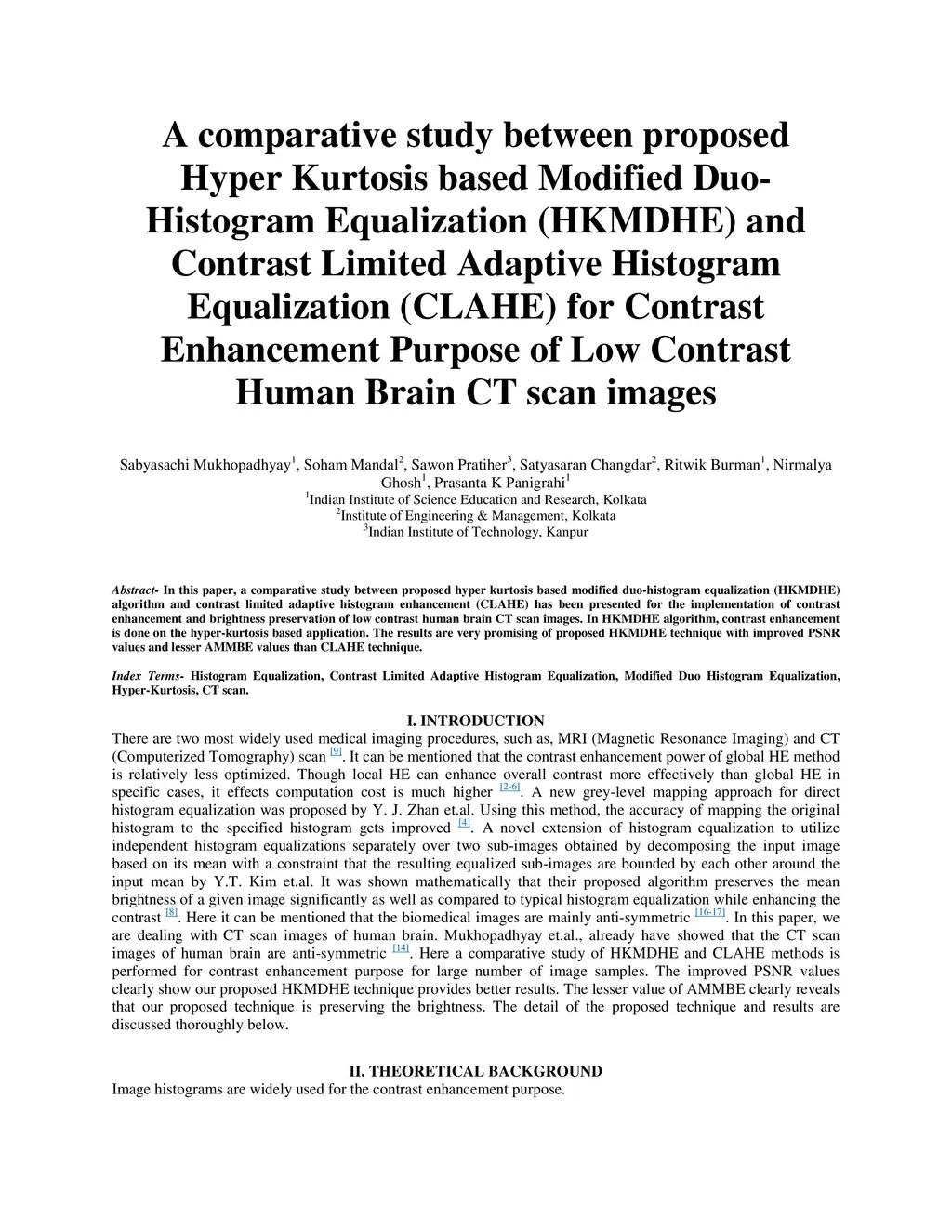 In this paper, a comparative study between proposed hyper kurtosis based modified duo-histogram equalization (HKMDHE) algorithm and contrast limited adaptive histogram enhancement (CLAHE) has been presented for the implementation of contrast enhancement and brightness preservation of low contrast human brain CT scan images. In HKMDHE algorithm, contrast enhancement is done on the hyper-kurtosis based application. The results are very promising of proposed HKMDHE technique with improved PSNR values and lesser AMMBE values than CLAHE technique.