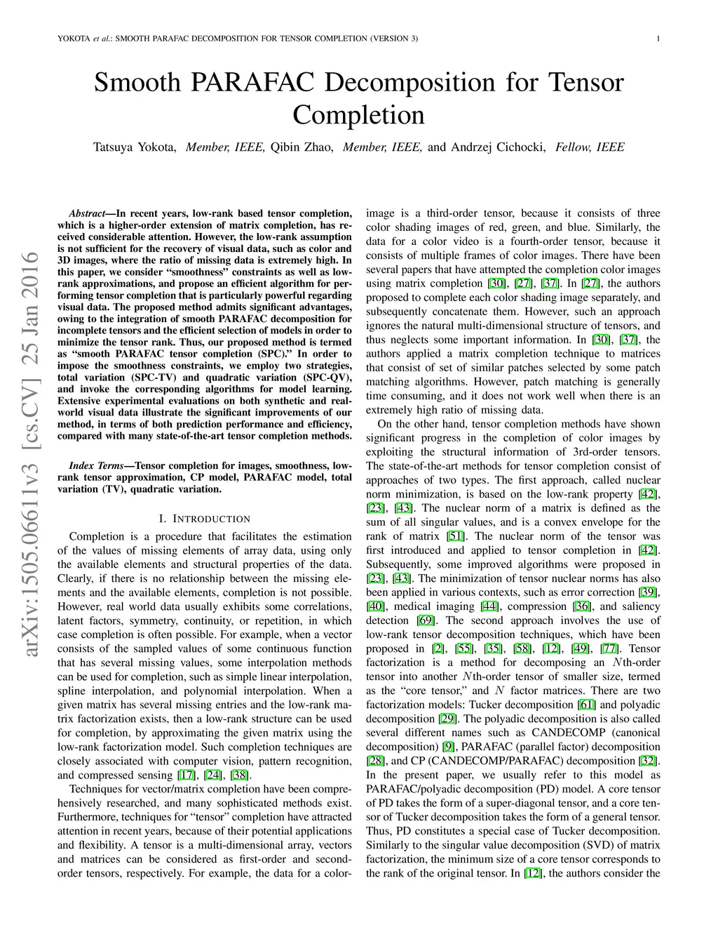 In recent years, low-rank based tensor completion, which is a higher-order extension of matrix completion, has received considerable attention. However, the low-rank assumption is not sufficient for the recovery of visual data, such as color and 3D images, where the ratio of missing data is extremely high. In this paper, we consider "smoothness" constraints as well as low-rank approximations, and propose an efficient algorithm for performing tensor completion that is particularly powerful regarding visual data. The proposed method admits significant advantages, owing to the integration of smooth PARAFAC decomposition for incomplete tensors and the efficient selection of models in order to minimize the tensor rank. Thus, our proposed method is termed as "smooth PARAFAC tensor completion (SPC)." In order to impose the smoothness constraints, we employ two strategies, total variation (SPC-TV) and quadratic variation (SPC-QV), and invoke the corresponding algorithms for model learning. Extensive experimental evaluations on both synthetic and real-world visual data illustrate the significant improvements of our method, in terms of both prediction performance and efficiency, compared with many state-of-the-art tensor completion methods.