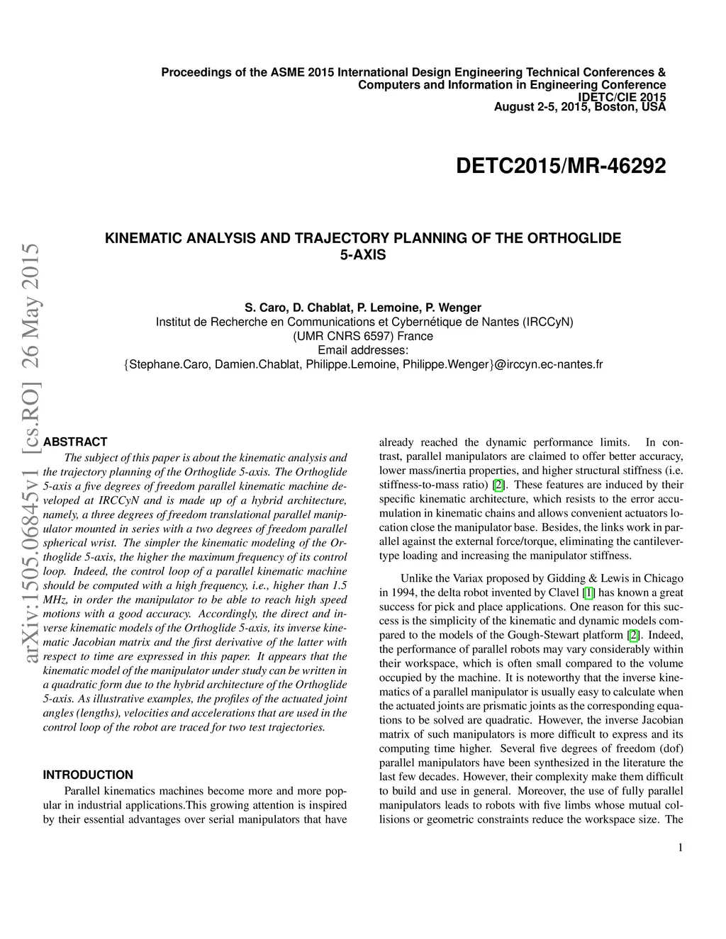 The subject of this paper is about the kinematic analysis and the trajectory planning of the Orthoglide 5-axis. The Orthoglide 5-axis a five degrees of freedom parallel kinematic machine developed at IRCCyN and is made up of a hybrid architecture, namely, a three degrees of freedom translational parallel manip-ulator mounted in series with a two degrees of freedom parallel spherical wrist. The simpler the kinematic modeling of the Or-thoglide 5-axis, the higher the maximum frequency of its control loop. Indeed, the control loop of a parallel kinematic machine should be computed with a high frequency, i.e., higher than 1.5 MHz, in order the manipulator to be able to reach high speed motions with a good accuracy. Accordingly, the direct and inverse kinematic models of the Orthoglide 5-axis, its inverse kine-matic Jacobian matrix and the first derivative of the latter with respect to time are expressed in this paper. It appears that the kinematic model of the manipulator under study can be written in a quadratic form due to the hybrid architecture of the Orthoglide 5-axis. As illustrative examples, the profiles of the actuated joint angles (lengths), velocities and accelerations that are used in the control loop of the robot are traced for two test trajectories.
