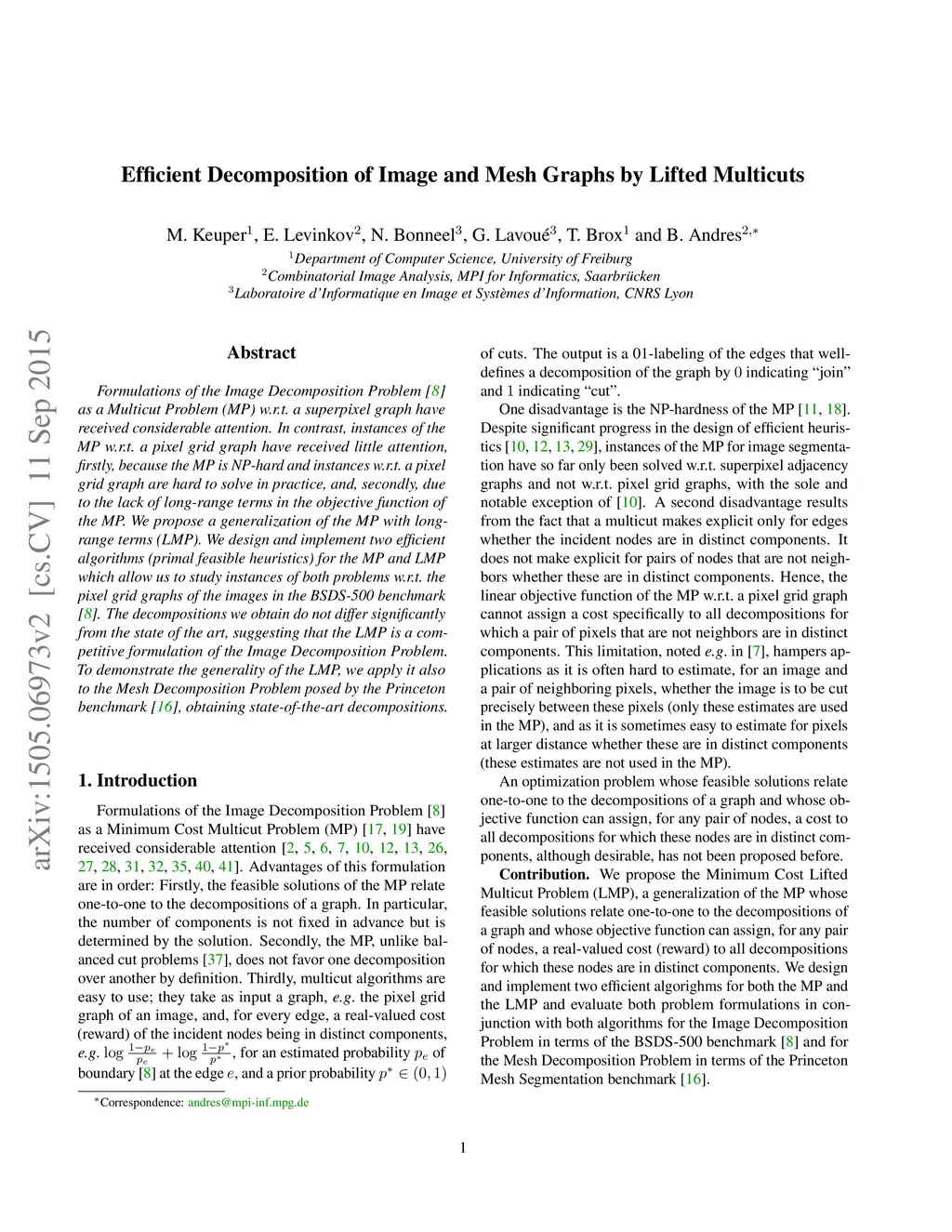 Formulations of the Image Decomposition Problem as a Multicut Problem (MP) w.r.t. a superpixel graph have received considerable attention. In contrast, instances of the MP w.r.t. a pixel grid graph have received little attention, firstly, because the MP is NP-hard and instances w.r.t. a pixel grid graph are hard to solve in practice, and, secondly, due to the lack of long-range terms in the objective function of the MP. We propose a generalization of the MP with long-range terms (LMP). We design and implement two efficient algorithms (primal feasible heuristics) for the MP and LMP which allow us to study instances of both problems w.r.t. the pixel grid graphs of the images in the BSDS-500 benchmark. The decompositions we obtain do not differ significantly from the state of the art, suggesting that the LMP is a competitive formulation of the Image Decomposition Problem. To demonstrate the generality of the LMP, we apply it also to the Mesh Decomposition Problem posed by the Princeton benchmark, obtaining state-of-the-art decompositions.
