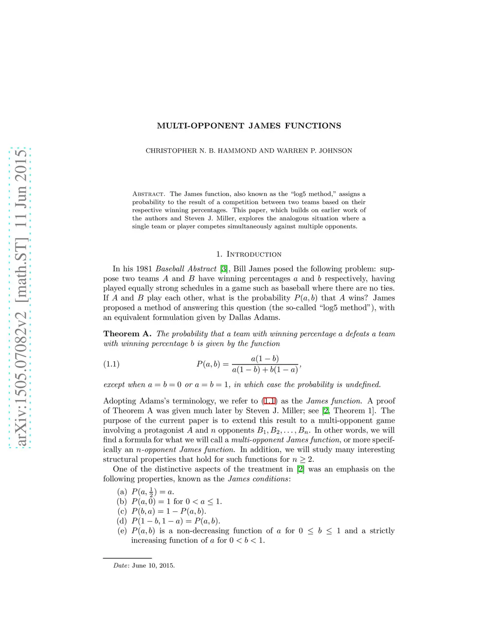 The James function, also known as the "log5 method," assigns a probability to the result of a competition between two teams based on their respective winning percentages. This paper, which builds on earlier work of the authors and Steven J. Miller, explores the analogous situation where a single team or player competes simultaneously against multiple opponents.