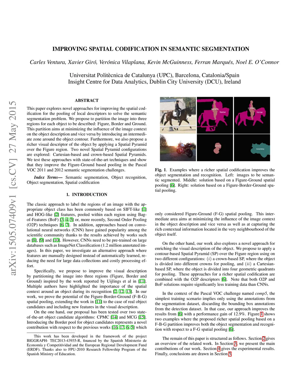 This paper explores novel approaches for improving the spatial codification for the pooling of local descriptors to solve the semantic segmentation problem. We propose to partition the image into three regions for each object to be described: Figure, Border and Ground. This partition aims at minimizing the influence of the image context on the object description and vice versa by introducing an intermediate zone around the object contour. Furthermore, we also propose a richer visual descriptor of the object by applying a Spatial Pyramid over the Figure region. Two novel Spatial Pyramid configurations are explored: Cartesian-based and crown-based Spatial Pyramids. We test these approaches with state-of-the-art techniques and show that they improve the Figure-Ground based pooling in the Pascal VOC 2011 and 2012 semantic segmentation challenges.