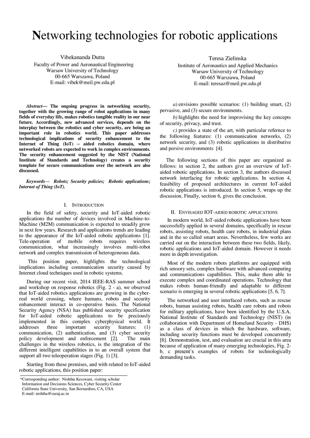 The ongoing progress in networking security, together with the growing range of robot applications in many fields of everyday life, makes robotics tangible reality in our near future. Accordingly, new advanced services, depends on the interplay between the robotics and cyber security, are being an important role in robotics world. This paper addresses technological implications of security enhancement to the Internet of Thing (IoT)-aided robotics domain, where networked robots are expected to work in complex environments. The security enhancement suggested by the NIST (National Institute of Standards and Technology) creates a security template for secure communications over the network are also discussed.